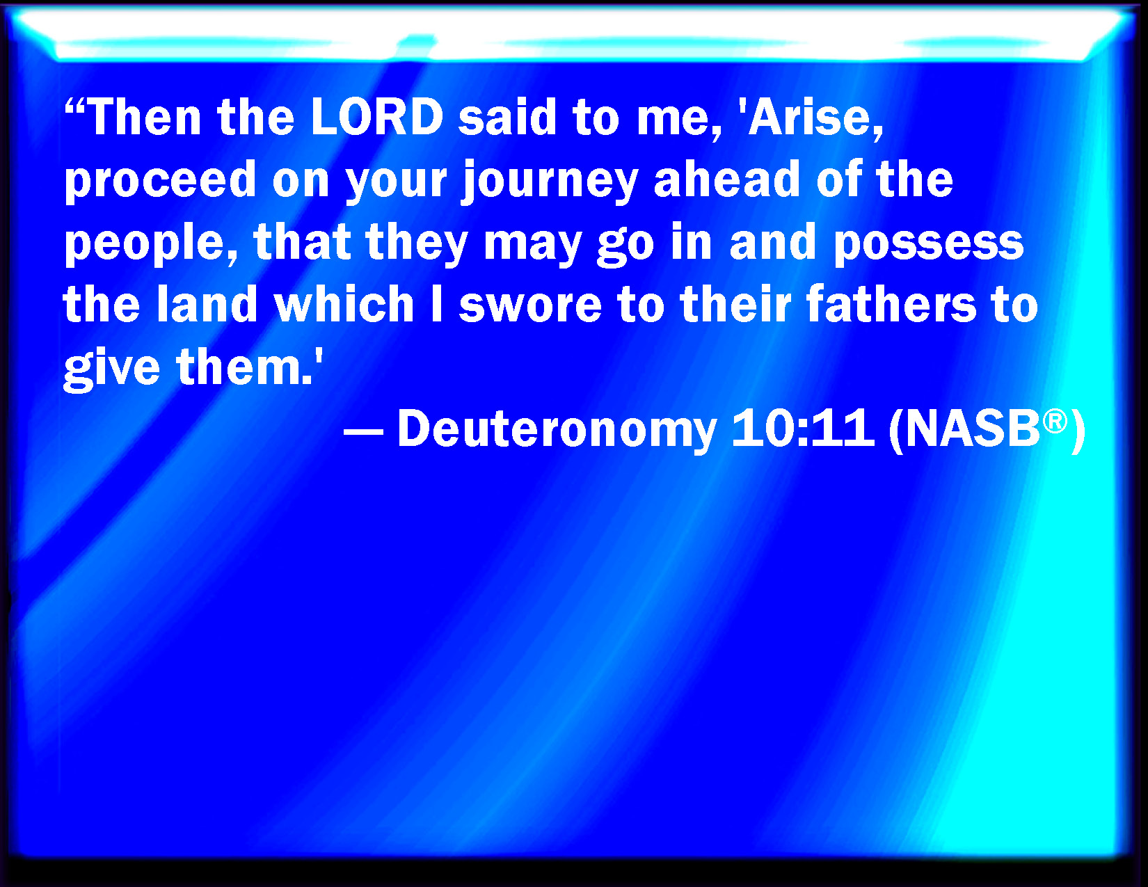 Bible Verse Slide Deuteronomy 10:11 And the LORD said to me, Arise, take your journey before the people, that they may go in and possess the land, which I swore to their fathers to give to them. KJV: And the LORD said unto me, Arise, take thy journey before the people, that they may go in and possess the land, which I sware unto their fathers to give unto them. DRB: And he said to me: Go, and walk before the people, that they may enter, and possess the land, which I swore to their fathers that I would give them. DBT: And Jehovah said unto me, Rise up, take thy journey before the people, that they may enter in and possess the land, which I swore unto their fathers to give unto them. ERV: And the LORD said unto me, Arise, take thy journey before the people; and they shall go in and possess the land, which I sware unto their fathers to give unto them. WBT: And the LORD said to me, Arise, take thy journey before the people, that they may go in and possess the land, which I swore to their fathers to give to them. WEB: Yahweh said to me, "Arise, take your journey before the people; and they shall go in and possess the land, which I swore to their fathers to give to them." YLT: 'And Jehovah saith unto me, Rise, go to journey before the people, and they go in and possess the land which I have sworn to their fathers to give to them.Links Deuteronomy 10:11 NIV • Deuteronomy 10:11 NLT • Deuteronomy 10:11 ESV • Deuteronomy 10:11 NASB • Deuteronomy 10:11 KJV • Deuteronomy 10:11 Interlinear • Deuteronomy 10:11 Commentaries • Deuteronomy 10:11 Parallel Texts • Deuteronomy 10:11 Bible Apps • Deuteronomy 10:11 Parallel • Bible Hub |
