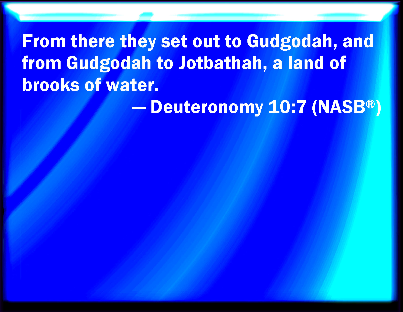 Bible Verse Slide Deuteronomy 10:7 From there they journeyed to Gudgodah; and from Gudgodah to Jotbath, a land of rivers of waters. KJV: From thence they journeyed unto Gudgodah; and from Gudgodah to Jotbath, a land of rivers of waters. DRB: From thence they came to Gadgad, from which place they departed, and camped in Jetebatha, in a land of waters and torrents. DBT: From thence they journeyed unto Gudgodah; and from Gudgodah to Jotbathah, a land of water-brooks.) ERV: From thence they journeyed unto Gudgodah; and from Gudgodah to Jotbathah, a land of brooks of water. WBT: From thence they journeyed to Gudgodah; and from Gudgodah to Jotbath, a land of rivers of waters. WEB: From there they traveled to Gudgodah; and from Gudgodah to Jotbathah, a land of brooks of water. YLT: thence they journeyed to Gudgodah, and from Gudgodah to Jotbathah, a land of brooks of water.Links Deuteronomy 10:7 NIV • Deuteronomy 10:7 NLT • Deuteronomy 10:7 ESV • Deuteronomy 10:7 NASB • Deuteronomy 10:7 KJV • Deuteronomy 10:7 Interlinear • Deuteronomy 10:7 Commentaries • Deuteronomy 10:7 Parallel Texts • Deuteronomy 10:7 Bible Apps • Deuteronomy 10:7 Parallel • Bible Hub |