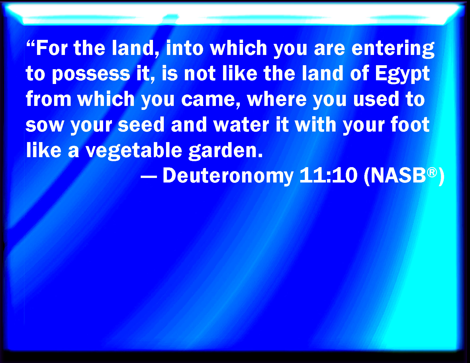 Bible Verse Slide Deuteronomy 11:10 For the land, where you go in to possess it, is not as the land of Egypt, from from where you came out, where you sowed your seed, and watered it with your foot, as a garden of herbs: KJV: For the land, whither thou goest in to possess it, is not as the land of Egypt, from whence ye came out, where thou sowedst thy seed, and wateredst it with thy foot, as a garden of herbs: DRB: For the land, which thou goest to possess, is not like the land of Egypt, from whence thou camest out, where, when the seed is sown, waters are brought in to water it after the manner of gardens. DBT: For the land, whither thou enterest in to possess it, is not as the land of Egypt, from whence ye came out, where thou sowedst thy seed, and wateredst it with thy foot, as a garden of herbs; ERV: For the land, whither thou goest in to possess it, is not as the land of Egypt, from whence ye came out, where thou sowedst thy seed, and wateredst it with thy foot, as a garden of herbs: WBT: For the land, whither thou goest in to possess it, is not as the land of Egypt, from whence ye came out, where thou didst sow thy seed, and water it with thy foot, as a garden of herbs: WEB: For the land, where you go in to possess it, isn't as the land of Egypt, that you came out from, where you sowed your seed, and watered it with your foot, as a garden of herbs; YLT: 'For the land whither thou art going in to possess it, is not as the land of Egypt whence ye have come out, where thou sowest thy seed, and hast watered with thy foot, as a garden of the green herb;Links Deuteronomy 11:10 NIV • Deuteronomy 11:10 NLT • Deuteronomy 11:10 ESV • Deuteronomy 11:10 NASB • Deuteronomy 11:10 KJV • Deuteronomy 11:10 Interlinear • Deuteronomy 11:10 Commentaries • Deuteronomy 11:10 Parallel Texts • Deuteronomy 11:10 Bible Apps • Deuteronomy 11:10 Parallel • Bible Hub |