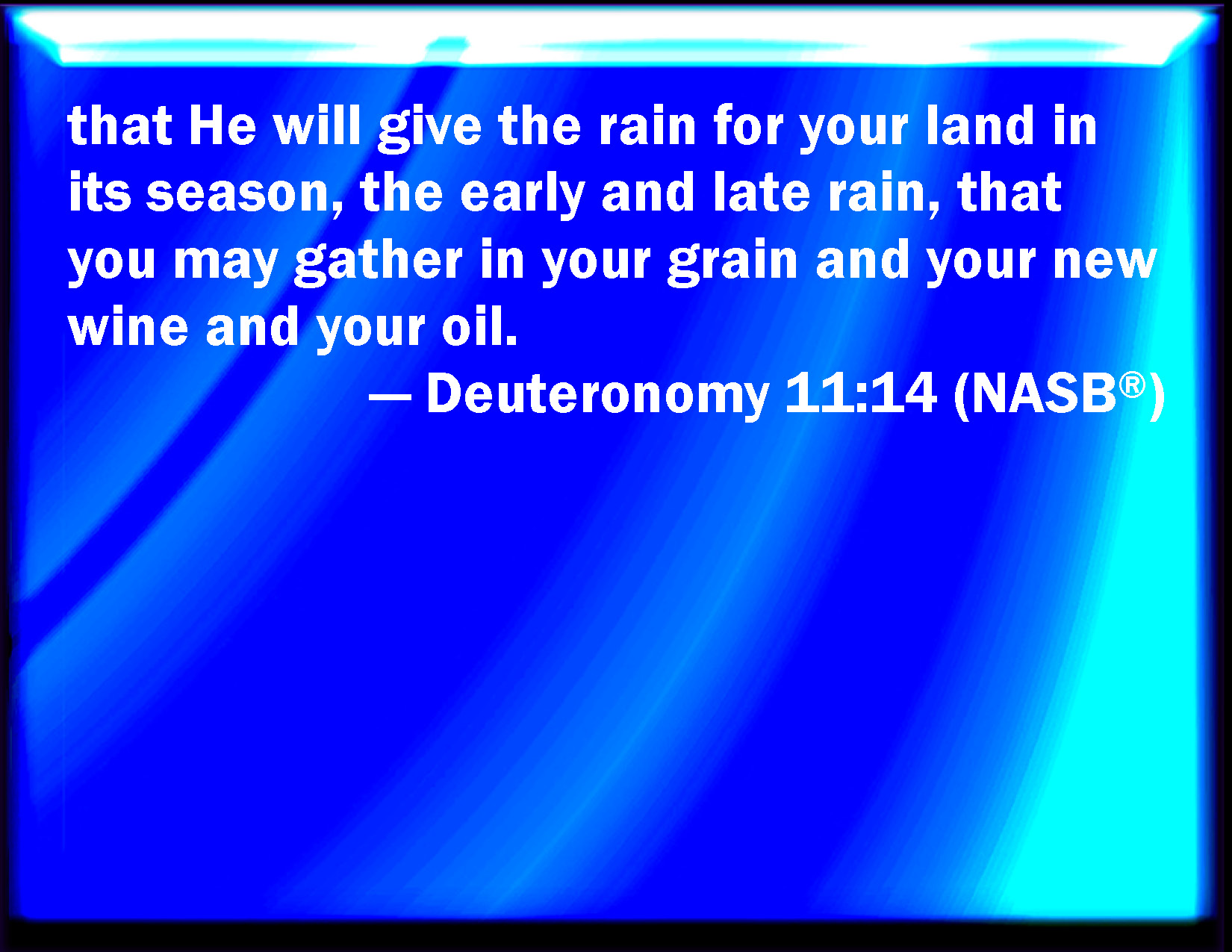 Bible Verse Slide Deuteronomy 11:14 That I will give you the rain of your land in his due season, the first rain and the latter rain, that you may gather in your corn, and your wine, and your oil. KJV: That I will give you the rain of your land in his due season, the first rain and the latter rain, that thou mayest gather in thy corn, and thy wine, and thine oil. DRB: He will give to your land the early rain and the latter rain, that you may gather in your corn, and your wine, and your oil, DBT: that I will give rain to your land in its season, the early rain and the latter rain; and thou shalt gather in thy corn, and thy new wine, and thine oil; ERV: that I will give the rain of your land in its season, the former rain and the latter rain, that thou mayest gather in thy corn, and thy wine, and thine oil. WBT: That I will give you the rain of your land in its due season, the former rain and the latter rain, that thou mayest gather in thy corn, and thy wine and thy oil. WEB: that I will give the rain of your land in its season, the former rain and the latter rain, that you may gather in your grain, and your new wine, and your oil. YLT: that I have given the rain of your land in its season — sprinkling and gathered — and thou hast gathered thy corn, and thy new wine, and thine oil,Links Deuteronomy 11:14 NIV • Deuteronomy 11:14 NLT • Deuteronomy 11:14 ESV • Deuteronomy 11:14 NASB • Deuteronomy 11:14 KJV • Deuteronomy 11:14 Interlinear • Deuteronomy 11:14 Commentaries • Deuteronomy 11:14 Parallel Texts • Deuteronomy 11:14 Bible Apps • Deuteronomy 11:14 Parallel • Bible Hub |