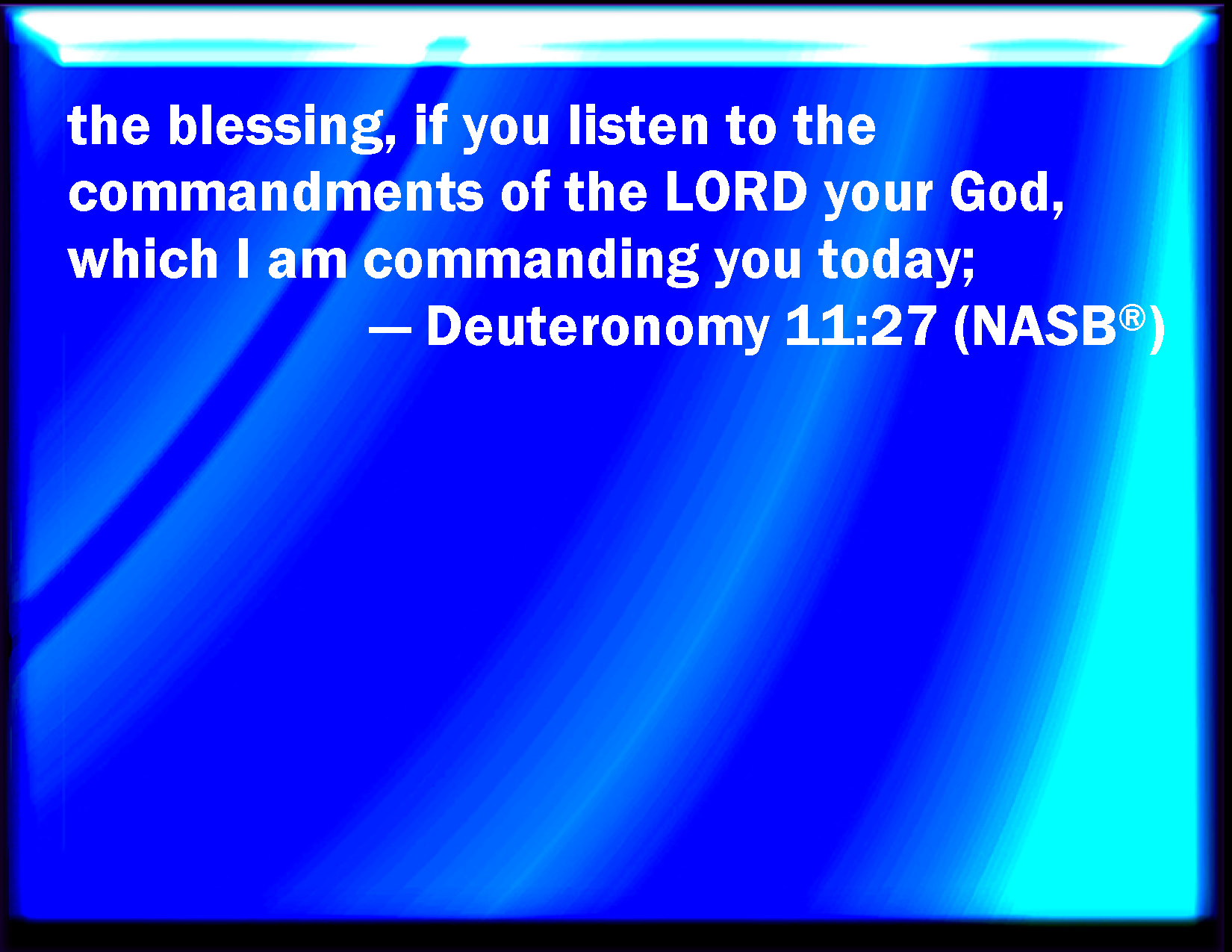 Bible Verse Slide Deuteronomy 11:27 A blessing, if you obey the commandments of the LORD your God, which I command you this day: KJV: A blessing, if ye obey the commandments of the LORD your God, which I command you this day: DRB: A blessing, if you obey the commandments of the Lord your God, which I command you this day: DBT: a blessing, if ye obey the commandments of Jehovah your God, which I command you this day; ERV: the blessing, if ye shall hearken unto the commandments of the LORD your God, which I command you this day: WBT: A blessing, if ye obey the commandments of the LORD your God which I command you this day; WEB: the blessing, if you shall listen to the commandments of Yahweh your God, which I command you this day; YLT: the blessing, when ye hearken unto the commands of Jehovah your God, which I am commanding you to-day;Links Deuteronomy 11:27 NIV • Deuteronomy 11:27 NLT • Deuteronomy 11:27 ESV • Deuteronomy 11:27 NASB • Deuteronomy 11:27 KJV • Deuteronomy 11:27 Interlinear • Deuteronomy 11:27 Commentaries • Deuteronomy 11:27 Parallel Texts • Deuteronomy 11:27 Bible Apps • Deuteronomy 11:27 Parallel • Bible Hub |