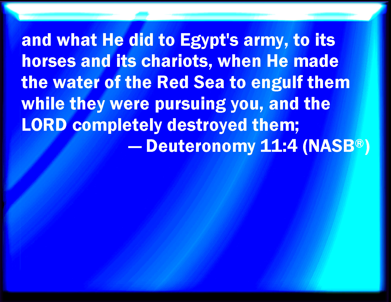 Bible Verse Slide Deuteronomy 11:4 And what he did to the army of Egypt, to their horses, and to their chariots; how he made the water of the Red sea to overflow them as they pursued after you, and how the LORD has destroyed them to this day; KJV: And what he did unto the army of Egypt, unto their horses, and to their chariots; how he made the water of the Red sea to overflow them as they pursued after you, and how the LORD hath destroyed them unto this day; DRB: And to all the host of the Egyptians, and to their horses and chariots: how the waters of the Red Sea covered them, when they pursued you, and how the Lord destroyed them until this present day: DBT: and what he did unto the army of Egypt, unto their horses, and unto their chariots, over which he made the water of the Red sea flow as they pursued after you, and Jehovah destroyed them unto this day; ERV: and what he did unto the army of Egypt, unto their horses, and to their chariots; how he made the water of the Red Sea to overflow them as they pursued after you, and how the LORD hath destroyed them unto this day; WBT: And what he did to the army of Egypt, to their horses, and to their chariots; how he made the water of the Red sea to overflow them as they pursued after you, and how the LORD hath destroyed them to this day; WEB: and what he did to the army of Egypt, to their horses, and to their chariots; how he made the water of the Red Sea to overflow them as they pursued after you, and how Yahweh has destroyed them to this day; YLT: and that which He hath done to the force of Egypt, to its horses, and to its chariot, when He hath caused the waters of the Red Sea to flow against their faces in their pursuing after them, and Jehovah destroyeth them, unto this day;Links Deuteronomy 11:4 NIV • Deuteronomy 11:4 NLT • Deuteronomy 11:4 ESV • Deuteronomy 11:4 NASB • Deuteronomy 11:4 KJV • Deuteronomy 11:4 Interlinear • Deuteronomy 11:4 Commentaries • Deuteronomy 11:4 Parallel Texts • Deuteronomy 11:4 Bible Apps • Deuteronomy 11:4 Parallel • Bible Hub |