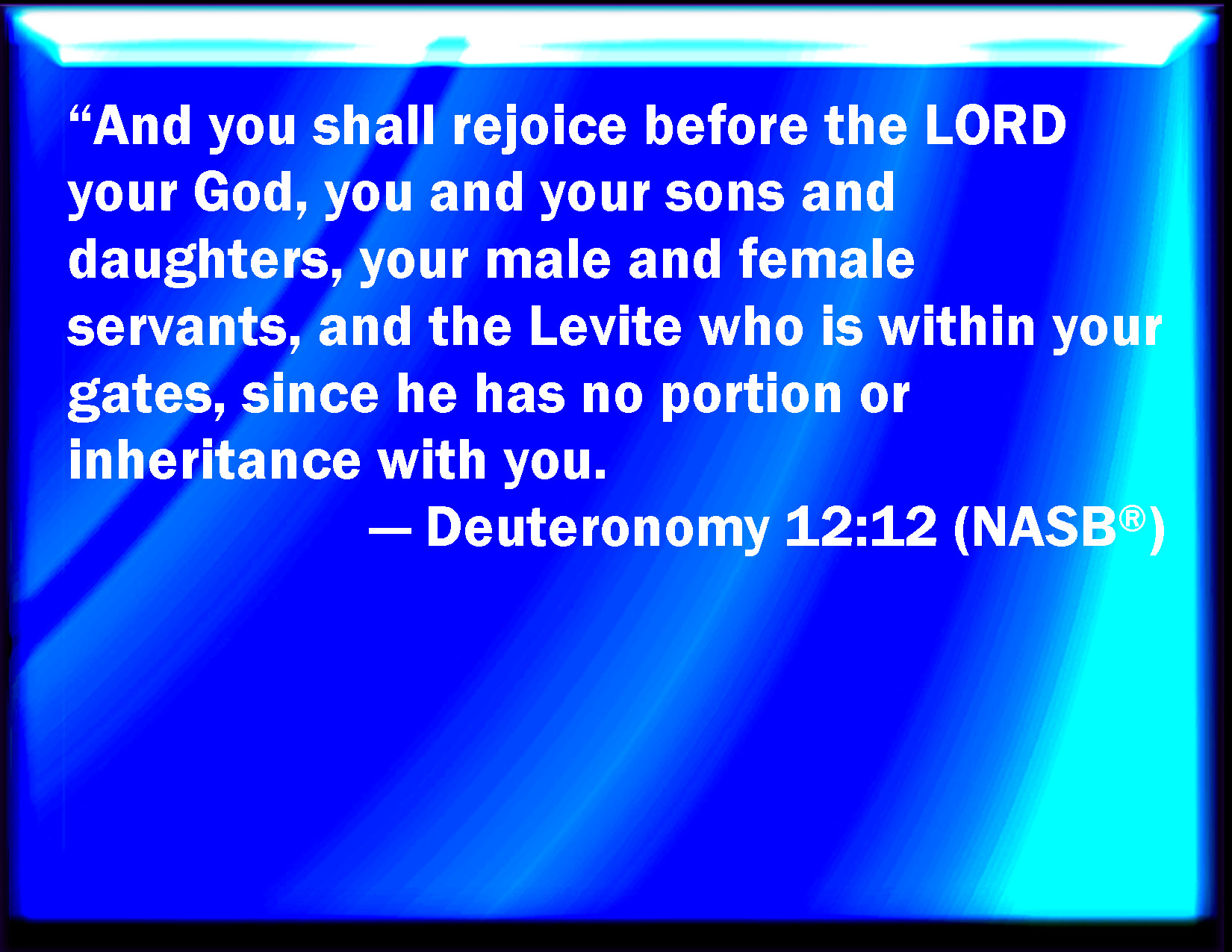 Bible Verse Slide Deuteronomy 12:12 And you shall rejoice before the LORD your God, you, and your sons, and your daughters, and your menservants, and your maidservants, and the Levite that is within your gates; for as much as he has no part nor inheritance with you. KJV: And ye shall rejoice before the LORD your God, ye, and your sons, and your daughters, and your menservants, and your maidservants, and the Levite that is within your gates; forasmuch as he hath no part nor inheritance with you. DRB: There shall you feast before the Lord your God, you and your sons and your daughters, your menservants and maid- servants, and the Levite that dwelleth in your cities. For he hath no other part and possession among you. DBT: And ye shall rejoice before Jehovah your God, ye, and your sons, and your daughters, and your bondmen, and your handmaids, and the Levite that is within your gates; for he hath no portion nor inheritance with you. ERV: and ye shall rejoice before the LORD your God, ye, and your sons, and your daughters, and your menservants, and your maidservants, and the Levite that is within your gates, forasmuch as he hath no portion nor inheritance with you. WBT: And ye shall rejoice before the LORD your God, ye, and your sons, and your daughters, and your men-servants, and your maid-servants, and the Levite that is within your gates; forasmuch as he hath no part nor inheritance with you. WEB: You shall rejoice before Yahweh your God, you, and your sons, and your daughters, and your male servants, and your female servants, and the Levite who is within your gates, because he has no portion nor inheritance with you. YLT: and ye have rejoiced before Jehovah your God, ye, and your sons, and your daughters, and your men-servants, and your handmaids, and the Levite who is within your gates, for he hath no part and inheritance with you.Links Deuteronomy 12:12 NIV • Deuteronomy 12:12 NLT • Deuteronomy 12:12 ESV • Deuteronomy 12:12 NASB • Deuteronomy 12:12 KJV • Deuteronomy 12:12 Interlinear • Deuteronomy 12:12 Commentaries • Deuteronomy 12:12 Parallel Texts • Deuteronomy 12:12 Bible Apps • Deuteronomy 12:12 Parallel • Bible Hub |