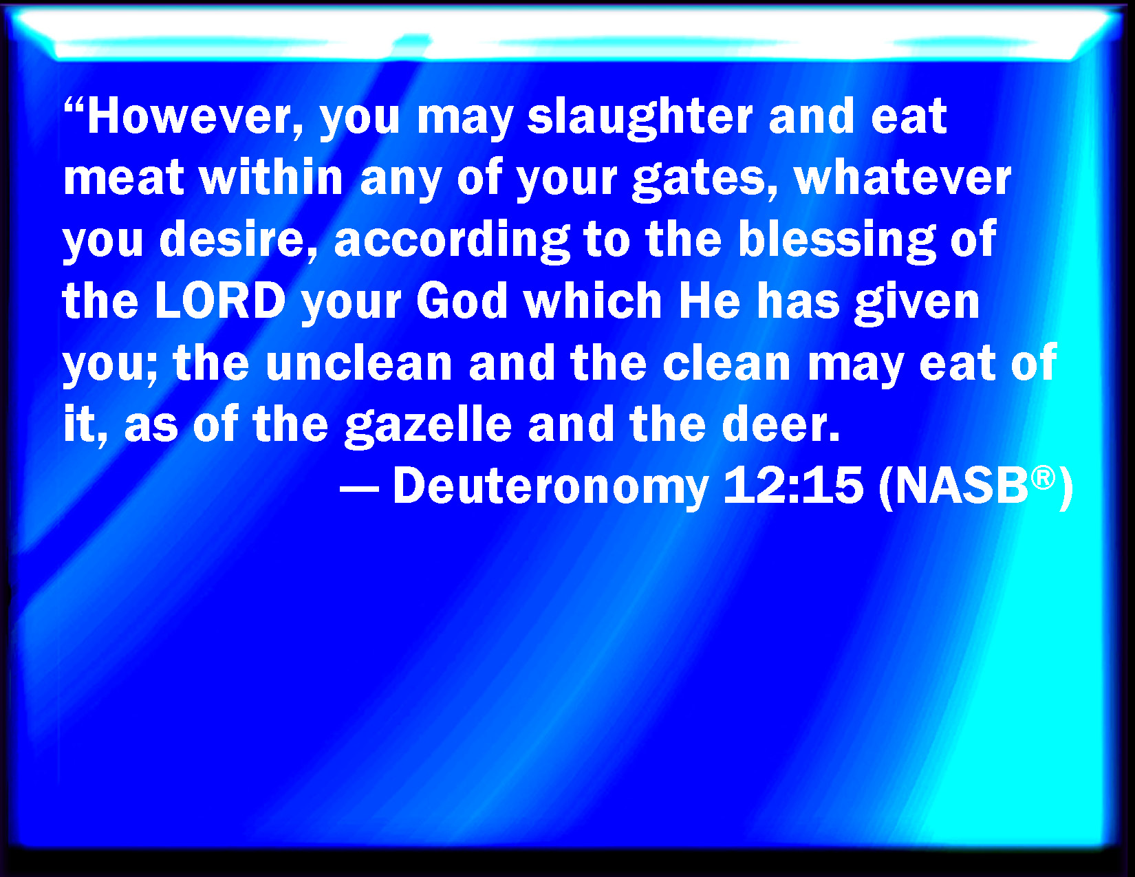 Bible Verse Slide Deuteronomy 12:15 Notwithstanding you may kill and eat flesh in all your gates, whatever your soul lusts after, according to the blessing of the LORD your God which he has given you: the unclean and the clean may eat thereof, as of the roebuck, and as of the hart. KJV: Notwithstanding thou mayest kill and eat flesh in all thy gates, whatsoever thy soul lusteth after, according to the blessing of the LORD thy God which he hath given thee: the unclean and the clean may eat thereof, as of the roebuck, and as of the hart. DRB: But if thou desirest to eat, and the eating of flesh delight thee, kill, and eat according to the blessing of the Lord thy God, which he hath given thee, in thy cities: whether it be unclean, that is to say, having blemish or defect: or clean, that is to say, sound and without blemish, such as may be offered, as the roe, and the hart, shalt thou eat it: DBT: Nevertheless, according to all the desire of thy soul thou mayest slay and eat flesh in all thy gates, according to the blessing of Jehovah thy God which he hath given thee: the unclean and the clean may eat thereof, as of the gazelle, and the hart. ERV: Notwithstanding thou mayest kill and eat flesh within all thy gates, after all the desire of thy soul, according to the blessing of the LORD thy God which he hath given thee: the unclean and the clean may eat thereof, as of the gazelle, and as of the hart. WBT: Notwithstanding, thou mayest kill and eat flesh in all thy gates, whatever thy soul desireth, according to the blessing of the LORD thy God which he hath given thee: the unclean and the clean may eat of it as of the roebuck, and as of the hart. WEB: Notwithstanding, you may kill and eat flesh within all your gates, after all the desire of your soul, according to the blessing of Yahweh your God which he has given you: the unclean and the clean may eat of it, as of the gazelle, and as of the hart. YLT: 'Only, with all the desire of thy soul thou dost sacrifice, and hast eaten flesh according to the blessing of Jehovah thy God which He hath given to thee, in all thy gates; the unclean and the clean do eat it, as of the roe, and as of the hart.Links Deuteronomy 12:15 NIV • Deuteronomy 12:15 NLT • Deuteronomy 12:15 ESV • Deuteronomy 12:15 NASB • Deuteronomy 12:15 KJV • Deuteronomy 12:15 Interlinear • Deuteronomy 12:15 Commentaries • Deuteronomy 12:15 Parallel Texts • Deuteronomy 12:15 Bible Apps • Deuteronomy 12:15 Parallel • Bible Hub |