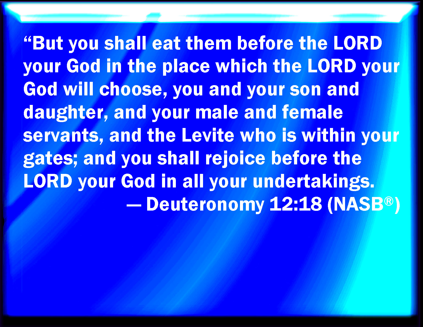 Bible Verse Slide Deuteronomy 12:18 But you must eat them before the LORD your God in the place which the LORD your God shall choose, you, and your son, and your daughter, and your manservant, and your maidservant, and the Levite that is within your gates: and you shall rejoice before the LORD your God in all that you put your hands to. KJV: But thou must eat them before the LORD thy God in the place which the LORD thy God shall choose, thou, and thy son, and thy daughter, and thy manservant, and thy maidservant, and the Levite that is within thy gates: and thou shalt rejoice before the LORD thy God in all that thou puttest thine hands unto. DRB: But thou shalt eat them before the Lord thy God in the place which the Lord thy God shall choose, thou and thy son and thy daughter, and thy manservant, and maidservant, and the Levite that dwelleth in thy cities: and thou shalt rejoice and be refreshed before the Lord thy God in all things, whereunto thou shalt put thy hand. DBT: but before Jehovah thy God shalt thou eat them in the place which Jehovah thy God will choose, thou and thy son, and thy daughter, and thy bondman, and thy handmaid, and the Levite that is within thy gates; and thou shalt rejoice before Jehovah thy God in all the business of thy hand. ERV: but thou shalt eat them before the LORD thy God in the place which the LORD thy God shall choose, thou, and thy son, and thy daughter, and thy manservant, and thy maidservant, and the Levite that is within thy gates: and thou shalt rejoice before the LORD thy God in all that thou puttest thine hand unto. WBT: But thou must eat them before the LORD thy God in the place which the LORD thy God shall choose, thou, and thy son, and thy daughter, and thy man-servant, and thy maid-servant, and the Levite that is within thy gates: and thou shalt rejoice before the LORD thy God in all that thou puttest thine hands to. WEB: but you shall eat them before Yahweh your God in the place which Yahweh your God shall choose, you, and your son, and your daughter, and your male servant, and your female servant, and the Levite who is within your gates: and you shall rejoice before Yahweh your God in all that you put your hand to. YLT: but before Jehovah thy God thou dost eat it, in the place which Jehovah thy God doth fix on, thou, and thy son, and thy daughter, and thy man-servant, and thy handmaid, and the Levite who is within thy gates, and thou hast rejoiced before Jehovah thy God in every putting forth of thy hand;Links Deuteronomy 12:18 NIV • Deuteronomy 12:18 NLT • Deuteronomy 12:18 ESV • Deuteronomy 12:18 NASB • Deuteronomy 12:18 KJV • Deuteronomy 12:18 Interlinear • Deuteronomy 12:18 Commentaries • Deuteronomy 12:18 Parallel Texts • Deuteronomy 12:18 Bible Apps • Deuteronomy 12:18 Parallel • Bible Hub |