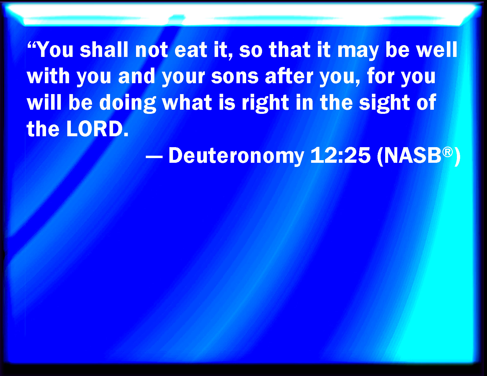 Bible Verse Slide Deuteronomy 12:25 You shall not eat it; that it may go well with you, and with your children after you, when you shall do that which is right in the sight of the LORD. KJV: Thou shalt not eat it; that it may go well with thee, and with thy children after thee, when thou shalt do that which is right in the sight of the LORD. DRB: That it may be well with thee and thy children after thee, when thou shalt do that which is pleasing in the sight of the Lord. DBT: thou shalt not eat it; that it may go well with thee, and with thy children after thee, when thou shalt do what is right in the eyes of Jehovah. ERV: Thou shalt not eat it; that it may go well with thee, and with thy children after thee, when thou shalt do that which is right in the eyes of the LORD. WBT: Thou shalt not eat it; that it may be well with thee, and with thy children after thee, when thou shalt do that which is right in the sight of the LORD. WEB: You shall not eat it; that it may go well with you, and with your children after you, when you shall do that which is right in the eyes of Yahweh. YLT: thou dost not eat it, in order that it may be well with thee, and with thy sons after thee, when thou dost that which is right in the eyes of Jehovah.Links Deuteronomy 12:25 NIV • Deuteronomy 12:25 NLT • Deuteronomy 12:25 ESV • Deuteronomy 12:25 NASB • Deuteronomy 12:25 KJV • Deuteronomy 12:25 Interlinear • Deuteronomy 12:25 Commentaries • Deuteronomy 12:25 Parallel Texts • Deuteronomy 12:25 Bible Apps • Deuteronomy 12:25 Parallel • Bible Hub |
