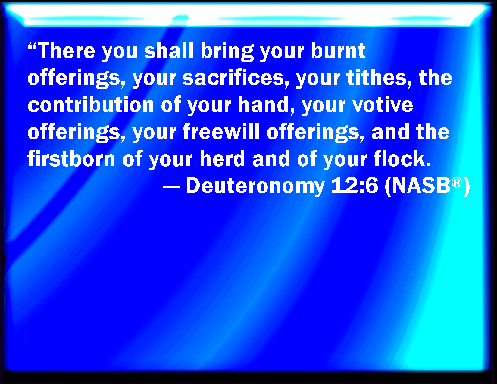 Bible Verse Slide Deuteronomy 12:6 And thither you shall bring your burnt offerings, and your sacrifices, and your tithes, and heave offerings of your hand, and your vows, and your freewill offerings, and the firstborn of your herds and of your flocks: KJV: And thither ye shall bring your burnt offerings, and your sacrifices, and your tithes, and heave offerings of your hand, and your vows, and your freewill offerings, and the firstlings of your herds and of your flocks: DRB: And you shall offer in that place your holocausts and victims, the tithes and firstfruits of your hands and your vows and gifts, the firstborn of your herds and your sheep. DBT: and thither ye shall bring your burnt-offerings and your sacrifices, and your tithes, and the heave-offering of your hand, and your vows, and your voluntary-offerings, and the firstlings of your kine and of your sheep; ERV: and thither ye shall bring your burnt offerings, and your sacrifices, and your tithes, and the heave offering of your hand, and your vows, and your freewill offerings, and the firstlings of your herd and of your flock: WBT: And thither ye shall bring your burnt-offerings, and your sacrifices, and your tithes, and heave-offerings of your hand, and your vows, and your free-will-offerings, and the firstlings of your herds, and of your flocks: WEB: and there you shall bring your burnt offerings, and your sacrifices, and your tithes, and the wave offering of your hand, and your vows, and your freewill offerings, and the firstborn of your herd and of your flock: YLT: and hast brought in thither your burnt-offerings, and your sacrifices, and your tithes, and the heave-offering of your hand, and your vows, and your free-will offerings, and the firstlings of your herd and of your flock;Links Deuteronomy 12:6 NIV • Deuteronomy 12:6 NLT • Deuteronomy 12:6 ESV • Deuteronomy 12:6 NASB • Deuteronomy 12:6 KJV • Deuteronomy 12:6 Interlinear • Deuteronomy 12:6 Commentaries • Deuteronomy 12:6 Parallel Texts • Deuteronomy 12:6 Bible Apps • Deuteronomy 12:6 Parallel • Bible Hub |