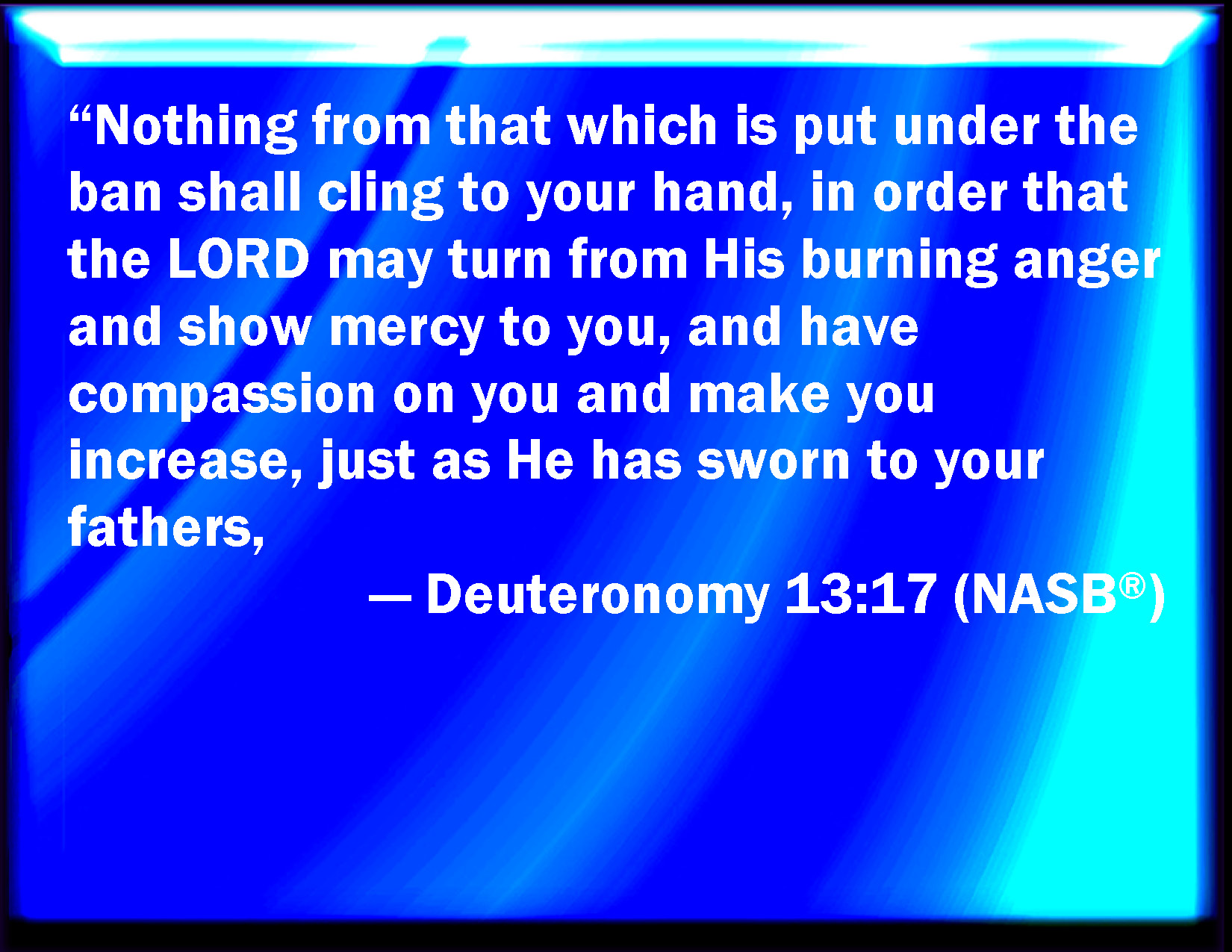 Bible Verse Slide Deuteronomy 13:17 And there shall stick nothing of the cursed thing to your hand: that the LORD may turn from the fierceness of his anger, and show you mercy, and have compassion on you, and multiply you, as he has sworn to your fathers; KJV: And there shall cleave nought of the cursed thing to thine hand: that the LORD may turn from the fierceness of his anger, and shew thee mercy, and have compassion upon thee, and multiply thee, as he hath sworn unto thy fathers; DRB: And there shall nothing of that anathema stick to thy hand: that the Lord may turn from the wrath of his fury, and may have mercy on thee, and multiply thee as he swore to thy fathers, DBT: And thou shalt not let anything cleave to thy hand of the devoted thing; that Jehovah may turn from the fierceness of his anger, and shew thee mercy, and have compassion upon thee, and multiply thee, as he hath sworn unto thy fathers; ERV: And there shall cleave nought of the devoted thing to thine hand: that the LORD may turn from the fierceness of his anger, and shew thee mercy, and have compassion upon thee, and multiply thee, as he hath sworn unto thy fathers; WBT: And there shall cleave naught of the cursed thing to thy hand: that the LORD may turn from the fierceness of his anger, and show thee mercy, and have compassion upon thee, and multiply thee, as he hath sworn to thy fathers; WEB: Nothing of the devoted thing shall cling to your hand; that Yahweh may turn from the fierceness of his anger, and show you mercy, and have compassion on you, and multiply you, as he has sworn to your fathers; YLT: and there doth not cleave to thy hand any of the devoted thing, so that Jehovah doth turn back from the fierceness of His anger, and hath given to thee mercies, and loved thee, and multiplied thee, as He hath sworn to thy fathers,Links Deuteronomy 13:17 NIV • Deuteronomy 13:17 NLT • Deuteronomy 13:17 ESV • Deuteronomy 13:17 NASB • Deuteronomy 13:17 KJV • Deuteronomy 13:17 Interlinear • Deuteronomy 13:17 Commentaries • Deuteronomy 13:17 Parallel Texts • Deuteronomy 13:17 Bible Apps • Deuteronomy 13:17 Parallel • Bible Hub |
