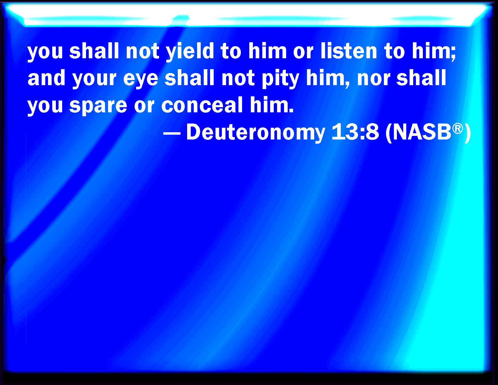 Bible Verse Slide Deuteronomy 13:8 You shall not consent to him, nor listen to him; neither shall your eye pity him, neither shall you spare, neither shall you conceal him: KJV: Thou shalt not consent unto him, nor hearken unto him; neither shall thine eye pity him, neither shalt thou spare, neither shalt thou conceal him: DRB: Consent not to him, hear him not, neither let thy eye spare him to pity and conceal him, DBT: thou shalt not consent unto him, nor hearken unto him; neither shall thine eye spare him, neither shalt thou pity him, neither shalt thou screen him, ERV: thou shalt not consent unto him, nor hearken unto him; neither shall thine eye pity him, neither shalt thou spare, neither shalt thou conceal him: WBT: Thou shalt not consent to him, nor hearken to him; neither shall thy eye pity him, neither shalt thou spare, neither shalt thou conceal him: WEB: you shall not consent to him, nor listen to him; neither shall your eye pity him, neither shall you spare, neither shall you conceal him: YLT: thou dost not consent to him, nor hearken unto him, nor doth thine eye have pity on him, nor dost thou spare, nor dost thou cover him over.Links Deuteronomy 13:8 NIV • Deuteronomy 13:8 NLT • Deuteronomy 13:8 ESV • Deuteronomy 13:8 NASB • Deuteronomy 13:8 KJV • Deuteronomy 13:8 Interlinear • Deuteronomy 13:8 Commentaries • Deuteronomy 13:8 Parallel Texts • Deuteronomy 13:8 Bible Apps • Deuteronomy 13:8 Parallel • Bible Hub |