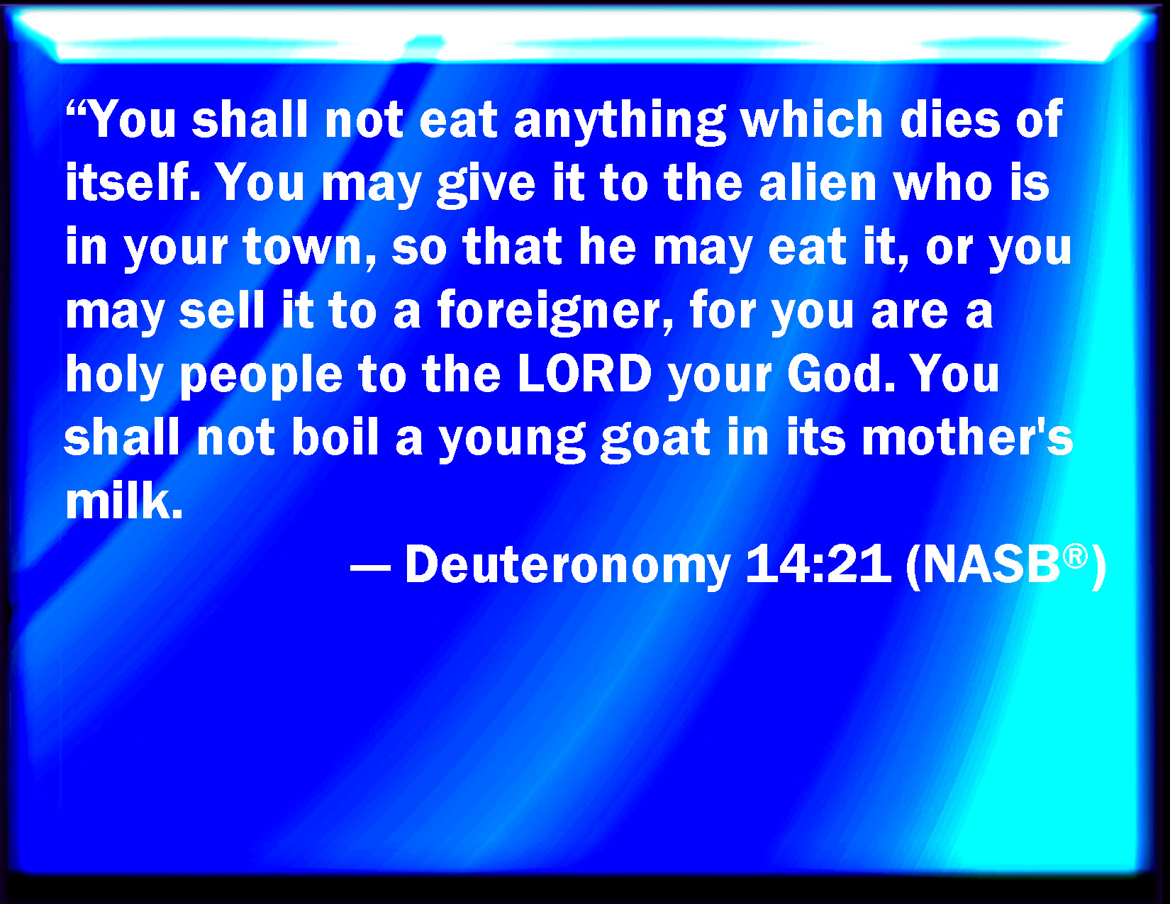 Ye shall not eat of any thing that dieth of itself: thou shalt give it to the stranger that is in thy gates, that he may eat it; or thou mayest sell it to an alien: for thou art a holy people to the LORD thy God. Thou shalt not seethe a kid in his mother's milk.