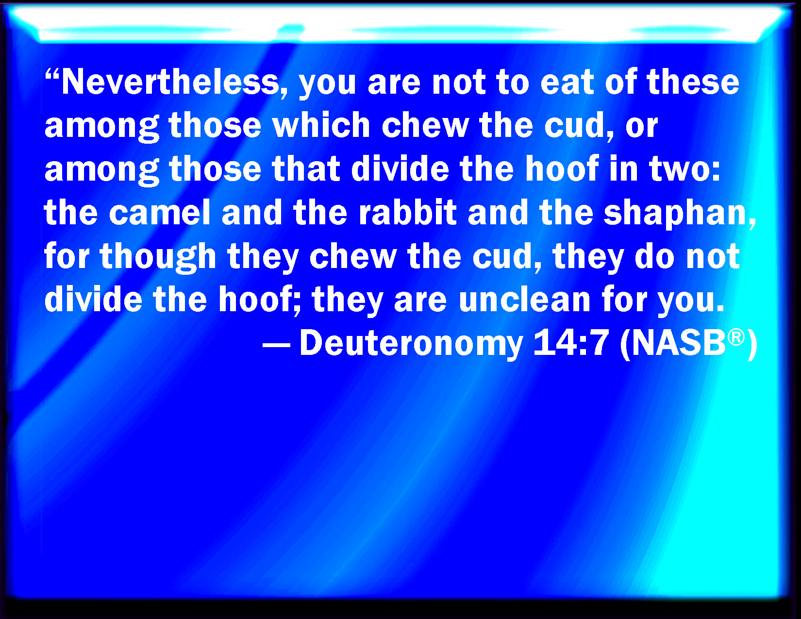 Bible Verse Slide Deuteronomy 14:7 Nevertheless these you shall not eat of them that chew the cud, or of them that divide the cloven hoof; as the camel, and the hare, and the coney: for they chew the cud, but divide not the hoof; therefore they are unclean to you. KJV: Nevertheless these ye shall not eat of them that chew the cud, or of them that divide the cloven hoof; as the camel, and the hare, and the coney: for they chew the cud, but divide not the hoof; therefore they are unclean unto you. DRB: But of them that chew the cud, but divide not the hoof, you shall not eat, such as the camel, the hare, and the cherogril: because they chew the cud, but divide not the hoof, they shall be unclean to you. DBT: Only these ye shall not eat of those that chew the cud, or of those with hoofs cloven and split open: the camel, and the hare, and the rock-badger; for they chew the cud, but have not cloven hoofs they shall be unclean unto you; ERV: Nevertheless these ye shall not eat of them that chew the cud, or of them that have the hoof cloven: the camel, and the hare, and the coney, because they chew the cud but part not the hoof, they are unclean unto you: WBT: Nevertheless, these ye shall not eat, of them that chew the cud, or of them that divide the cloven hoof; the camel, and the hare, and the coney: for they chew the cud, but divide not the hoof; therefore they are unclean to you. WEB: Nevertheless these you shall not eat of them that chew the cud, or of those who have the hoof cloven: the camel, and the hare, and the rabbit; because they chew the cud but don't part the hoof, they are unclean to you. YLT: Only, this ye do not eat, of those bringing up the cud, and of those dividing the cloven hoof: the camel, and the hare, and the rabbit, for they are bringing up the cud but the hoof have not divided; unclean they are to you;Links Deuteronomy 14:7 NIV • Deuteronomy 14:7 NLT • Deuteronomy 14:7 ESV • Deuteronomy 14:7 NASB • Deuteronomy 14:7 KJV • Deuteronomy 14:7 Interlinear • Deuteronomy 14:7 Commentaries • Deuteronomy 14:7 Parallel Texts • Deuteronomy 14:7 Bible Apps • Deuteronomy 14:7 Parallel • Bible Hub |