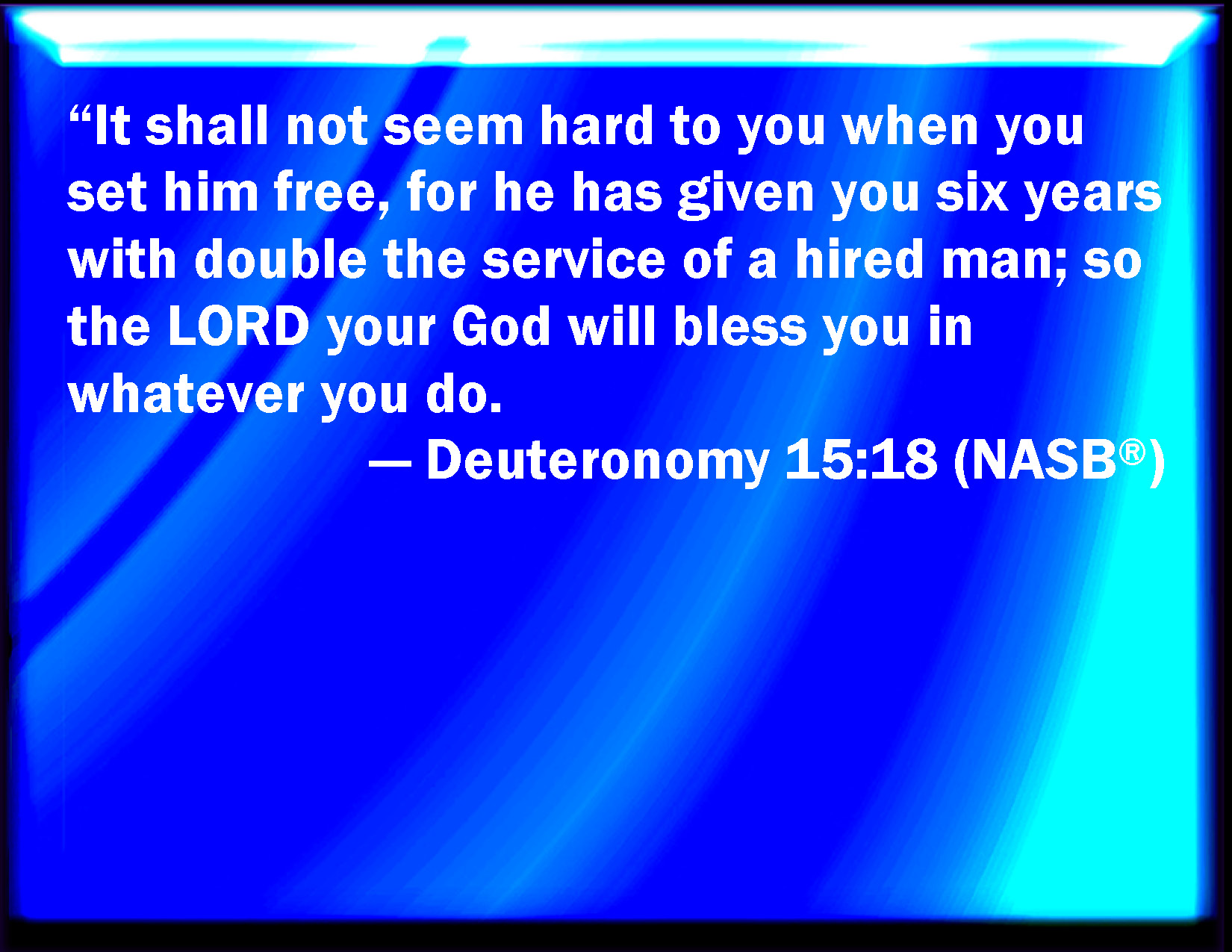 Let it not seem hard unto thee, when thou sendest him away free from thee; for double the worth of a hired servant hath he been to thee, in serving thee six years; and Jehovah thy God will bless thee in all that thou doest.