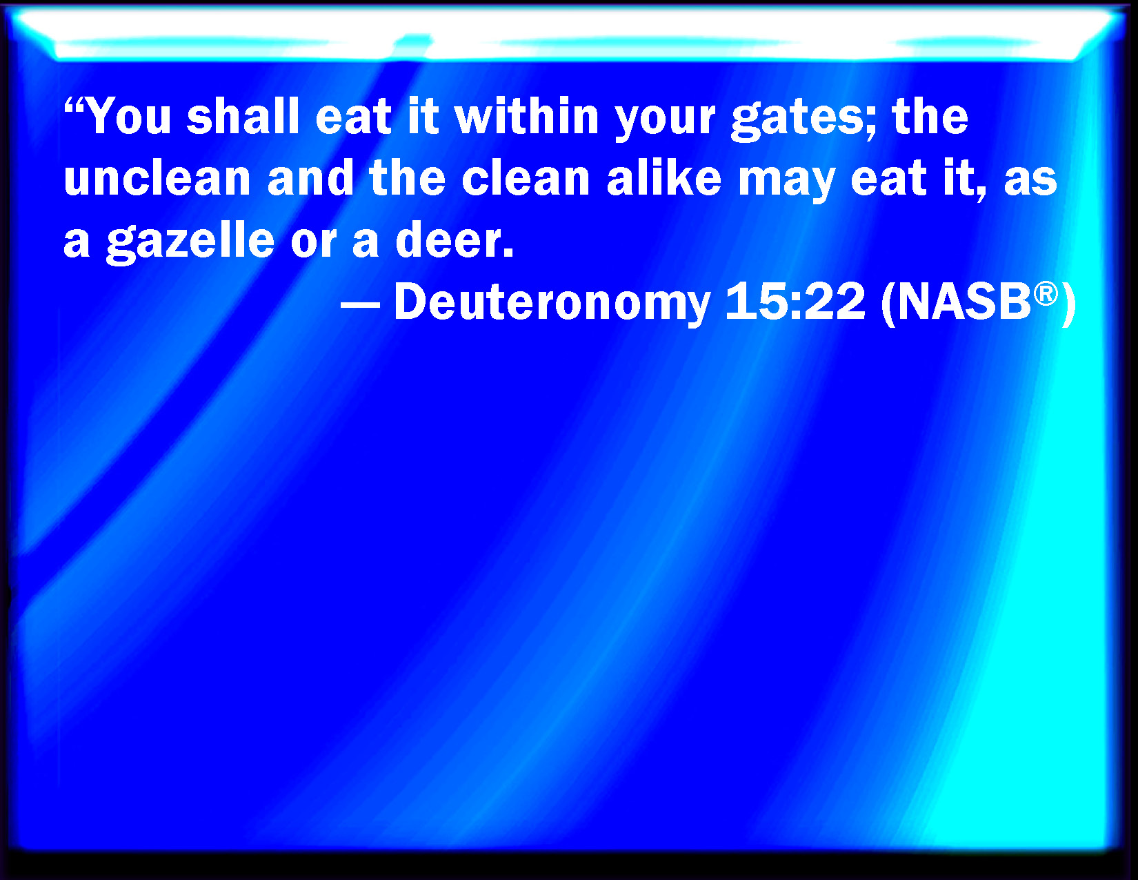 Bible Verse Slide Deuteronomy 15:22 You shall eat it within your gates: the unclean and the clean person shall eat it alike, as the roebuck, and as the hart. KJV: Thou shalt eat it within thy gates: the unclean and the clean person shall eat it alike, as the roebuck, and as the hart. DRB: But thou shalt eat it within the gates of thy city: the clean and the unclean shall eat them alike, as the roe and as the hart. DBT: In thy gates shalt thou eat it; the unclean and the clean shall eat it alike, as the gazelle and as the hart. ERV: Thou shalt eat it within thy gates: the unclean and the clean shall eat it alike, as the gazelle, and as the hart. WBT: Thou shalt eat it within thy gates: the unclean and the clean person shall eat it alike, as the roebuck, and as the hart. WEB: You shall eat it within your gates: the unclean and the clean [shall eat it] alike, as the gazelle, and as the hart. YLT: within thy gates thou dost eat it, the unclean and the clean alike, as the roe, and as the hart.Links Deuteronomy 15:22 NIV • Deuteronomy 15:22 NLT • Deuteronomy 15:22 ESV • Deuteronomy 15:22 NASB • Deuteronomy 15:22 KJV • Deuteronomy 15:22 Interlinear • Deuteronomy 15:22 Commentaries • Deuteronomy 15:22 Parallel Texts • Deuteronomy 15:22 Bible Apps • Deuteronomy 15:22 Parallel • Bible Hub |