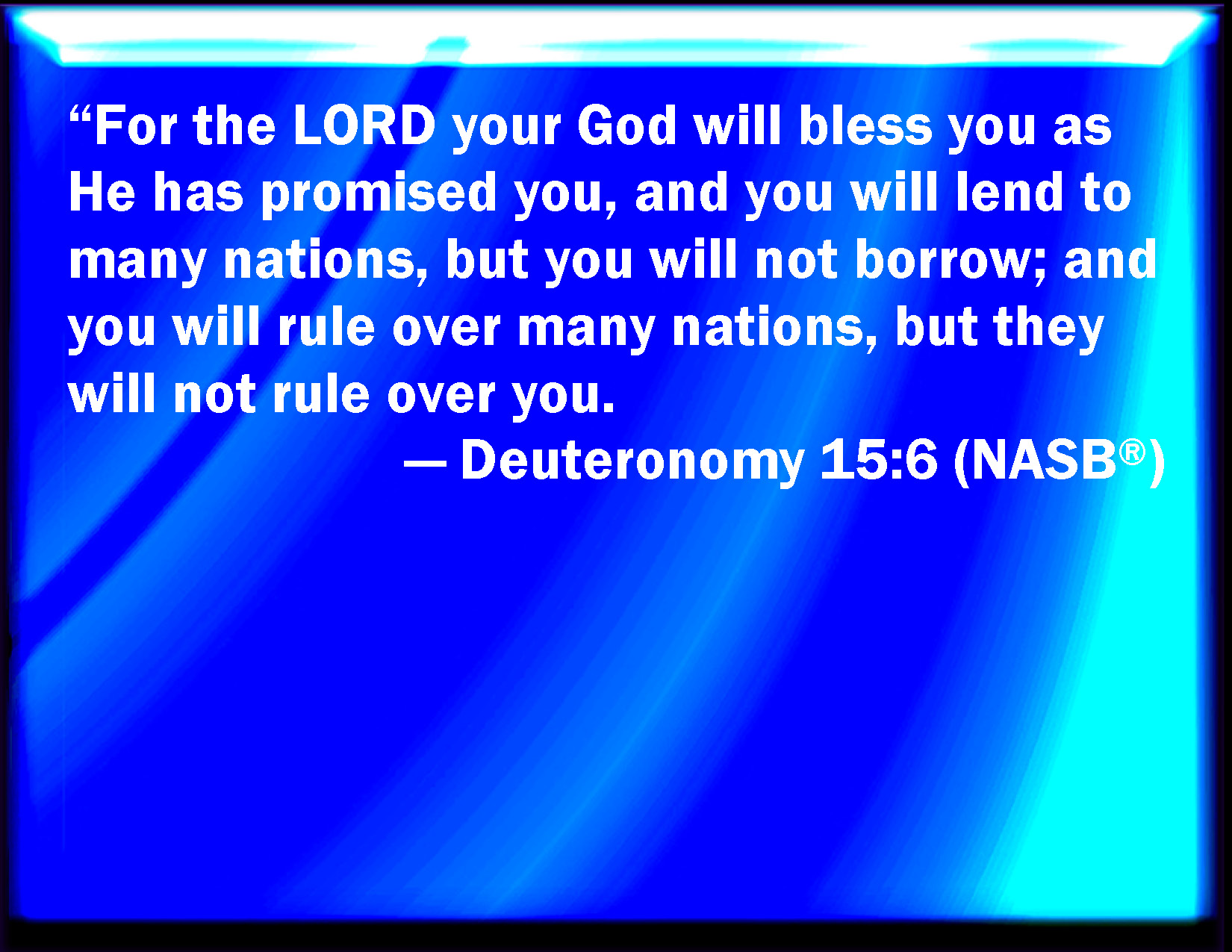 Bible Verse Slide Deuteronomy 15:6 For the LORD your God blesses you, as he promised you: and you shall lend to many nations, but you shall not borrow; and you shall reign over many nations, but they shall not reign over you. KJV: For the LORD thy God blesseth thee, as he promised thee: and thou shalt lend unto many nations, but thou shalt not borrow; and thou shalt reign over many nations, but they shall not reign over thee. DRB: Thou shalt lend to many nations, and thou shalt borrow of no man. Thou shalt have dominion over very many nations, and no one shall have dominion over thee. DBT: For Jehovah thy God will bless thee, as he promised thee; and thou shalt lend on pledge to many nations, but thou shalt not borrow; and thou shalt rule over many nations, but they shall not rule over thee. ERV: For the LORD thy God will bless thee, as he promised thee: and thou shalt lend unto many nations, but thou shalt not borrow; and thou shalt rule over many nations, but they shall not rule over thee. WBT: For the LORD thy God shall bless thee, as he promised thee: and thou shalt lend to many nations, but thou shalt not borrow; and thou shalt reign over many nations, but they shall not reign over thee. WEB: For Yahweh your God will bless you, as he promised you: and you shall lend to many nations, but you shall not borrow; and you shall rule over many nations, but they shall not rule over you. YLT: for Jehovah thy God hath blessed thee as He hath spoken to thee; and thou hast lent to many nations, and thou hast not borrowed; and thou hast ruled over many nations, and over thee they do not rule.Links Deuteronomy 15:6 NIV • Deuteronomy 15:6 NLT • Deuteronomy 15:6 ESV • Deuteronomy 15:6 NASB • Deuteronomy 15:6 KJV • Deuteronomy 15:6 Interlinear • Deuteronomy 15:6 Commentaries • Deuteronomy 15:6 Parallel Texts • Deuteronomy 15:6 Bible Apps • Deuteronomy 15:6 Parallel • Bible Hub |