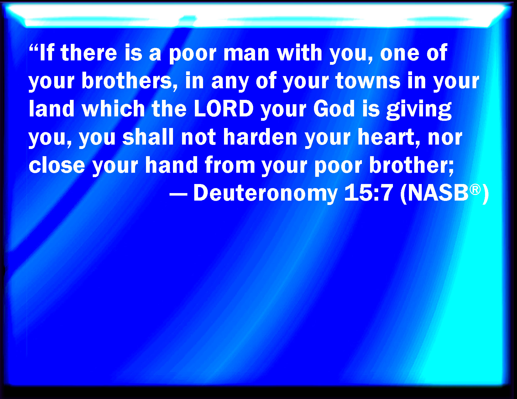 Bible Verse Slide Deuteronomy 15:7 If there be among you a poor man of one of your brothers within any of your gates in your land which the LORD your God gives you, you shall not harden your heart, nor shut your hand from your poor brother: KJV: If there be among you a poor man of one of thy brethren within any of thy gates in thy land which the LORD thy God giveth thee, thou shalt not harden thine heart, nor shut thine hand from thy poor brother: DRB: If one of thy brethren that dwelleth within the gates of thy city in the land which the Lord thy God will give thee, come to poverty: thou shalt not harden thy heart, nor close thy hand, DBT: If there be amongst you a poor man, any one of thy brethren in one of thy gates, in thy land which Jehovah thy God giveth thee, thou shalt not harden thy heart, nor shut thy hand from thy brother in need; ERV: If there be with thee a poor man, one of thy brethren, within any of thy gates in thy land which the LORD thy God giveth thee, thou shalt not harden thine heart, nor shut thine hand from thy poor brother: WBT: If there shall be among you a poor man of one of thy brethren within any of thy gates in thy land which the LORD the God giveth thee, thou shalt not harden thy heart, nor shut thy hand from thy poor brother: WEB: If a poor man, one of your brothers, is with you within any of your gates in your land which Yahweh your God gives you, you shall not harden your heart, nor shut your hand from your poor brother; YLT: 'When there is with thee any needy one of one of thy brethren, in one of thy cities, in thy land which Jehovah thy God is giving to thee, thou dost not harden thy heart, nor shut thy hand from thy needy brother;Links Deuteronomy 15:7 NIV • Deuteronomy 15:7 NLT • Deuteronomy 15:7 ESV • Deuteronomy 15:7 NASB • Deuteronomy 15:7 KJV • Deuteronomy 15:7 Interlinear • Deuteronomy 15:7 Commentaries • Deuteronomy 15:7 Parallel Texts • Deuteronomy 15:7 Bible Apps • Deuteronomy 15:7 Parallel • Bible Hub |