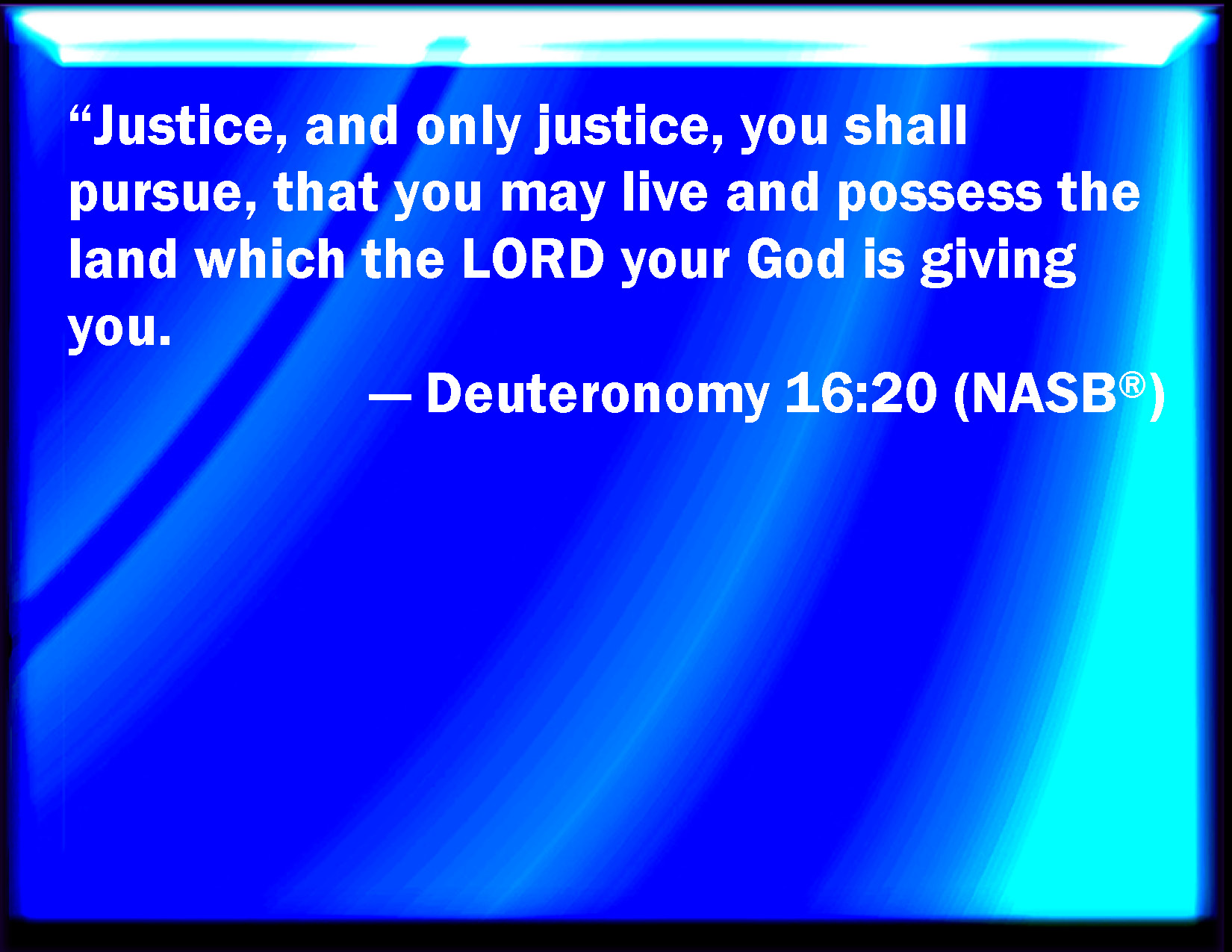 Bible Verse Slide Deuteronomy 16:20 That which is altogether just shall you follow, that you may live, and inherit the land which the LORD your God gives you. KJV: That which is altogether just shalt thou follow, that thou mayest live, and inherit the land which the LORD thy God giveth thee. DRB: Thou shalt follow justly after that which is just: that thou mayst live and possess the land, which the Lord thy God shall give thee. DBT: Perfect justice shalt thou follow, that thou mayest live, and possess the land that Jehovah thy God giveth thee. ERV: That which is altogether just shalt thou follow, that thou mayest live, and inherit the land which the LORD thy God giveth thee. WBT: That which is altogether just shalt thou follow, that thou mayest live, and inherit the land which the LORD thy God giveth thee. WEB: You shall follow that which is altogether just, that you may live, and inherit the land which Yahweh your God gives you. YLT: Righteousness — righteousness thou dost pursue, so that thou livest, and hast possessed the land which Jehovah thy God is giving to thee.Links Deuteronomy 16:20 NIV • Deuteronomy 16:20 NLT • Deuteronomy 16:20 ESV • Deuteronomy 16:20 NASB • Deuteronomy 16:20 KJV • Deuteronomy 16:20 Interlinear • Deuteronomy 16:20 Commentaries • Deuteronomy 16:20 Parallel Texts • Deuteronomy 16:20 Bible Apps • Deuteronomy 16:20 Parallel • Bible Hub |
