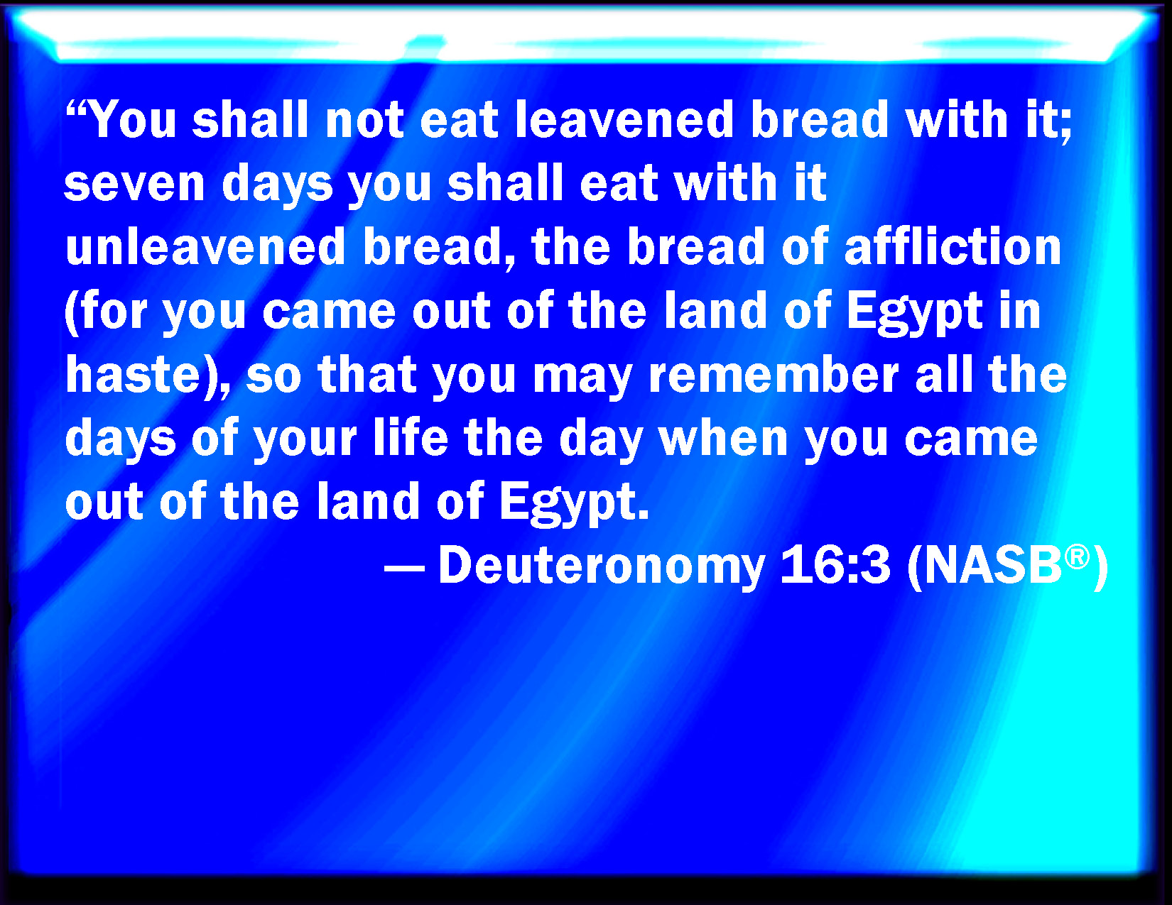 Deuteronomy 16:3 You shall eat no leavened bread with it; seven days shall you eat unleavened bread therewith, even the bread of affliction; for you came forth out of the land of Egypt in haste: that you may remember the day when you came forth out of the land of Egypt all the days of your life.