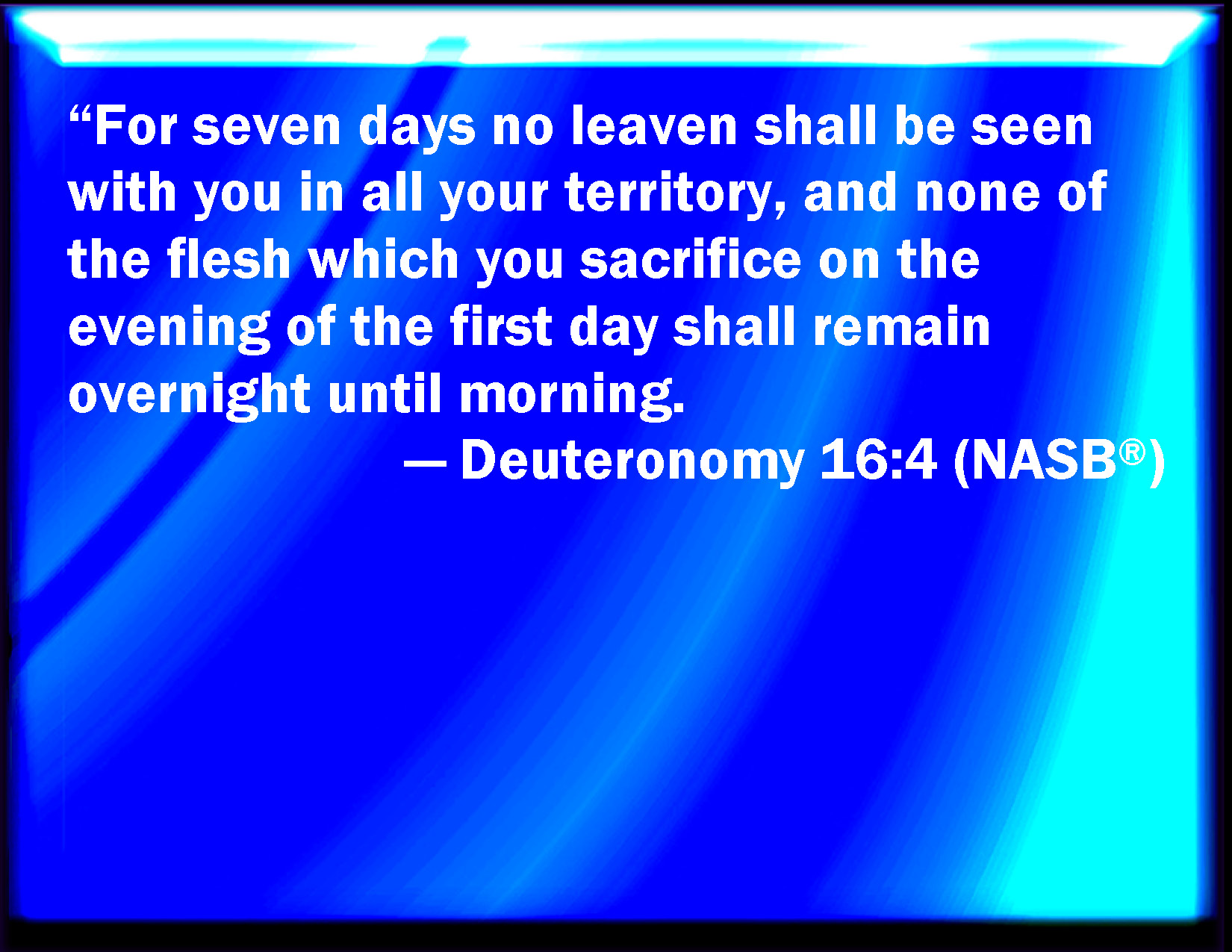 Bible Verse Slide Deuteronomy 16:4 And there shall be no leavened bread seen with you in all your coast seven days; neither shall there any thing of the flesh, which you sacrificed the first day at even, remain all night until the morning. KJV: And there shall be no leavened bread seen with thee in all thy coast seven days; neither shall there any thing of the flesh, which thou sacrificedst the first day at even, remain all night until the morning. DRB: No leaven shall be seen in all thy coasts for seven days, neither shall any of the flesh of that which was sacrificed the first day in the evening remain until morning. DBT: And there shall be no leaven seen with thee in all thy borders seven days; neither shall any of the flesh, which thou sacrificedst at even on the first day, be left over night until the morning. — ERV: And there shall be no leaven seen with thee in all thy borders seven days; neither shall any of the flesh, which thou sacrificest the first day at even, remain all night until the morning. WBT: And there shall be no leavened bread seen with thee in all thy borders seven days; neither shall there any thing of the flesh, which thou didst sacrifice the first day at evening, remain all night until the morning. WEB: No yeast shall be seen with you in all your borders seven days; neither shall any of the flesh, which you sacrifice the first day at evening, remain all night until the morning. YLT: and there is not seen with thee leaven in all thy border seven days, and there doth not remain of the flesh which thou dost sacrifice at evening on the first day till morning.Links Deuteronomy 16:4 NIV • Deuteronomy 16:4 NLT • Deuteronomy 16:4 ESV • Deuteronomy 16:4 NASB • Deuteronomy 16:4 KJV • Deuteronomy 16:4 Interlinear • Deuteronomy 16:4 Commentaries • Deuteronomy 16:4 Parallel Texts • Deuteronomy 16:4 Bible Apps • Deuteronomy 16:4 Parallel • Bible Hub |