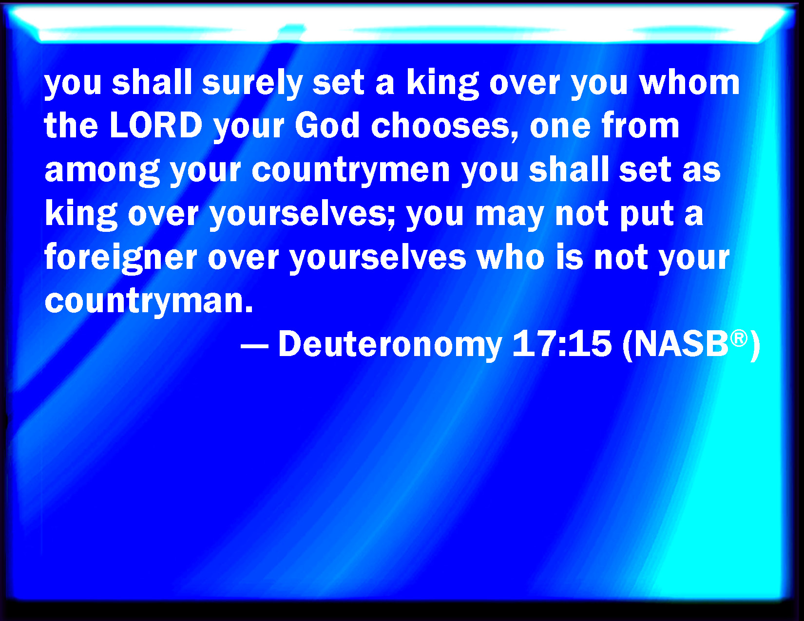 Bible Verse Slide Deuteronomy 17:15 You shall in any wise set him king over you, whom the LORD your God shall choose: one from among your brothers shall you set king over you: you may not set a stranger over you, which is not your brother. KJV: Thou shalt in any wise set him king over thee, whom the LORD thy God shall choose: one from among thy brethren shalt thou set king over thee: thou mayest not set a stranger over thee, which is not thy brother. DRB: Thou shalt set him whom the Lord thy God shall choose out of the number of thy brethren. Thou mayst not make a man of another nation king, that is not thy brother. DBT: thou shalt only set him king over thee whom Jehovah thy God will choose: from among thy brethren shalt thou set a king over thee; thou mayest not set a foreigner over thee, who is not thy brother. ERV: thou shalt in any wise set him king over thee, whom the LORD thy God shall choose: one from among thy brethren shalt thou set king over thee: thou mayest not put a foreigner over thee, which is not thy brother. WBT: Thou shalt in any wise set him king over thee whom the LORD thy God shall choose: one from among thy brethren shalt thou set king over thee: thou mayest not set a stranger over thee, who is not thy brother. WEB: you shall surely set him king over yourselves, whom Yahweh your God shall choose: one from among your brothers you shall set king over you; you may not put a foreigner over you, who is not your brother. YLT: thou dost certainly set over thee a king on whom Jehovah doth fix; from the midst of thy brethren thou dost set over thee a king; thou art not able to set over thee a stranger, who is not thy brother.Links Deuteronomy 17:15 NIV • Deuteronomy 17:15 NLT • Deuteronomy 17:15 ESV • Deuteronomy 17:15 NASB • Deuteronomy 17:15 KJV • Deuteronomy 17:15 Interlinear • Deuteronomy 17:15 Commentaries • Deuteronomy 17:15 Parallel Texts • Deuteronomy 17:15 Bible Apps • Deuteronomy 17:15 Parallel • Bible Hub |