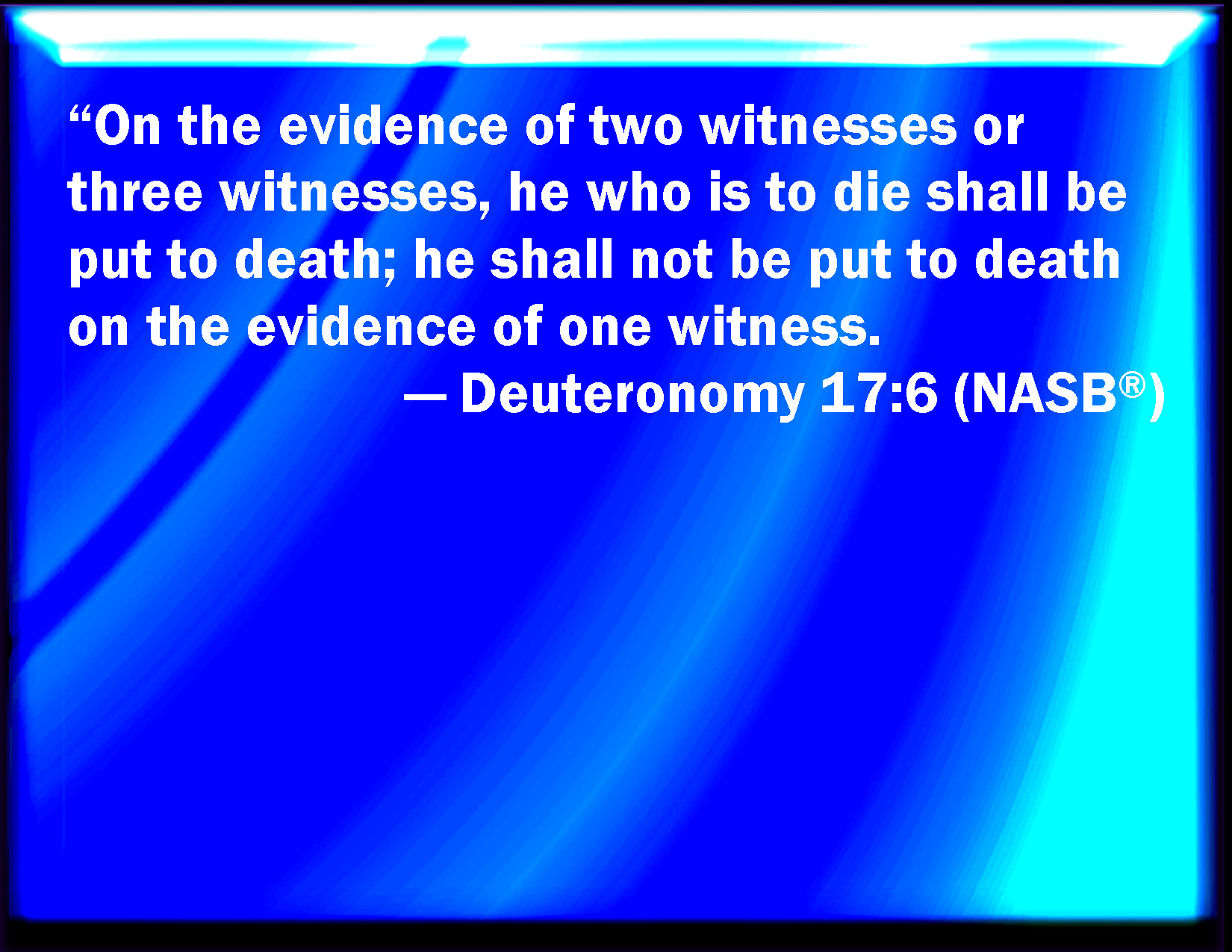 Bible Verse Slide Deuteronomy 17:6 At the mouth of two witnesses, or three witnesses, shall he that is worthy of death be put to death; but at the mouth of one witness he shall not be put to death. KJV: At the mouth of two witnesses, or three witnesses, shall he that is worthy of death be put to death; but at the mouth of one witness he shall not be put to death. DRB: By the mouth of two or three witnesses shall he die that is to be slain. Let no man be put to death, when only one beareth witness against him. DBT: At the mouth of two witnesses, or three witnesses, shall he that is to die be put to death: he shall not be put to death at the mouth of one witness. ERV: At the mouth of two witnesses, or three witnesses, shall he that is to die be put to death; at the mouth of one witness he shall not be put to death. WBT: At the mouth of two witnesses, or three witnesses, shall he that is worthy of death be put to death; but at the mouth of one witness he shall not be put to death. WEB: At the mouth of two witnesses, or three witnesses, shall he who is to die be put to death; at the mouth of one witness he shall not be put to death. YLT: By the mouth of two witnesses or of three witnesses is he who is dead put to death; he is not put to death by the mouth of one witness;Links Deuteronomy 17:6 NIV • Deuteronomy 17:6 NLT • Deuteronomy 17:6 ESV • Deuteronomy 17:6 NASB • Deuteronomy 17:6 KJV • Deuteronomy 17:6 Interlinear • Deuteronomy 17:6 Commentaries • Deuteronomy 17:6 Parallel Texts • Deuteronomy 17:6 Bible Apps • Deuteronomy 17:6 Parallel • Bible Hub |