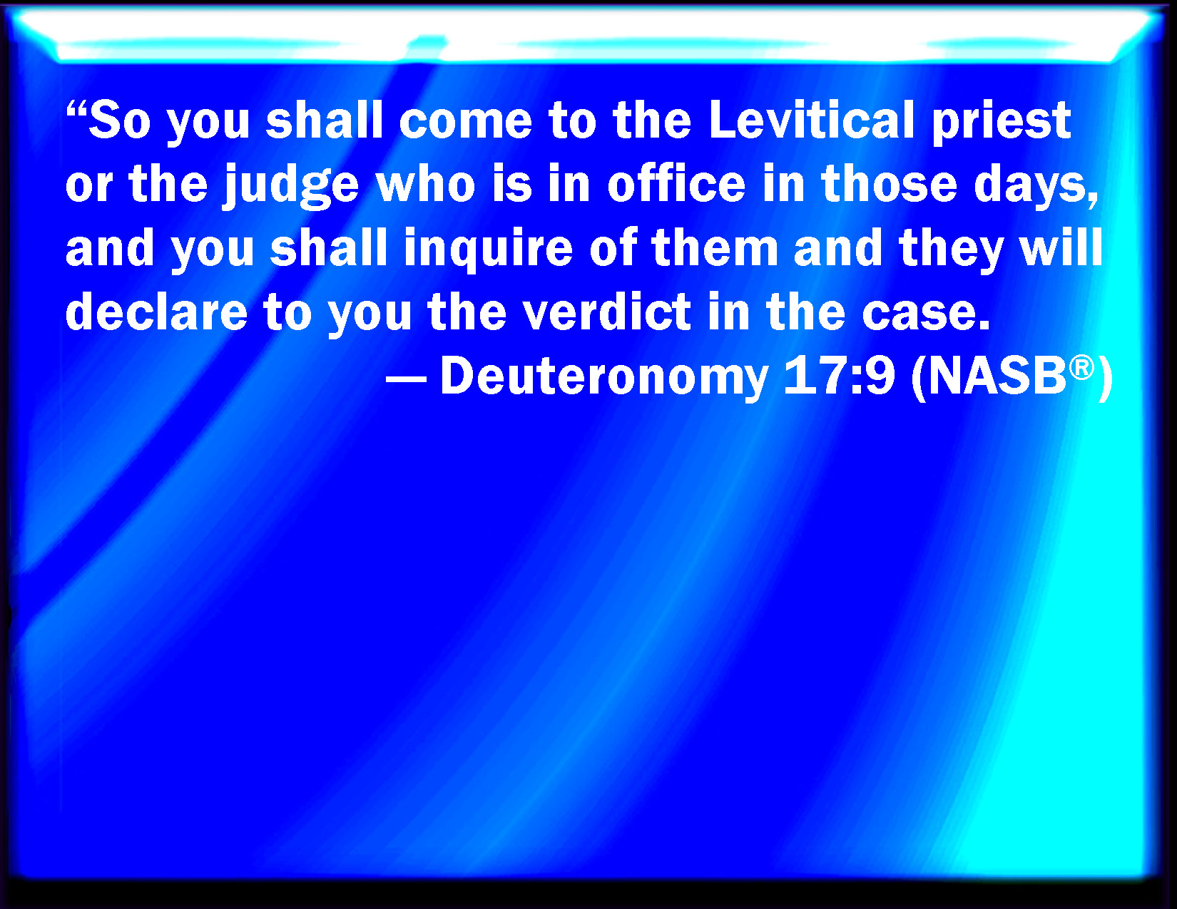 Bible Verse Slide Deuteronomy 17:9 And you shall come to the priests the Levites, and to the judge that shall be in those days, and inquire; and they shall show you the sentence of judgment: KJV: And thou shalt come unto the priests the Levites, and unto the judge that shall be in those days, and inquire; and they shall shew thee the sentence of judgment: DRB: And thou shalt come to the priests of the Levitical race, and to the judge, that shall be at that time: and thou shalt ask of them, and they shall shew thee the truth of the judgment. DBT: And thou shalt come unto the priests, the Levites, and unto the judge that shall be in those days, and inquire; and they shall declare unto thee the sentence of judgment; ERV: and thou shalt come unto the priests the Levites, and unto the judge that shall be in those days: and thou shalt inquire; and they shall shew thee the sentence of judgment: WBT: And thou shalt come to the priests the Levites, and to the judge that shall be in those days, and inquire; and they shall show thee the sentence of judgment: WEB: and you shall come to the priests the Levites, and to the judge who shall be in those days: and you shall inquire; and they shall show you the sentence of judgment. YLT: and hast come in unto the priests, the Levites, and unto the judge who is in those days, and hast inquired, and they have declared to thee the word of judgment,Links Deuteronomy 17:9 NIV • Deuteronomy 17:9 NLT • Deuteronomy 17:9 ESV • Deuteronomy 17:9 NASB • Deuteronomy 17:9 KJV • Deuteronomy 17:9 Interlinear • Deuteronomy 17:9 Commentaries • Deuteronomy 17:9 Parallel Texts • Deuteronomy 17:9 Bible Apps • Deuteronomy 17:9 Parallel • Bible Hub |