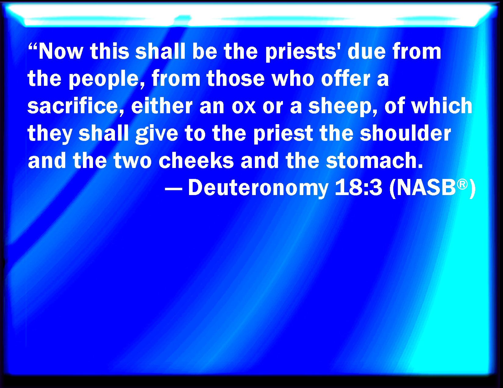 Bible Verse Slide Deuteronomy 18:3 And this shall be the priest's due from the people, from them that offer a sacrifice, whether it be ox or sheep; and they shall give to the priest the shoulder, and the two cheeks, and the maw. KJV: And this shall be the priest's due from the people, from them that offer a sacrifice, whether it be ox or sheep; and they shall give unto the priest the shoulder, and the two cheeks, and the maw. DRB: This shall be the priest's due from the people, and from them that offer victims: whether they sacrifice an ox, or a sheep, they shall give to the priest the shoulder and the breast: DBT: And this shall be the priest's due from the people, from them that sacrifice a sacrifice, whether ox, or sheep: they shall give unto the priest the shoulder, and the jawbones, and the maw. ERV: And this shall be the priests' due from the people, from them that offer a sacrifice, whether it be ox or sheep, that they shall give unto the priest the shoulder, and the two cheeks, and the maw. WBT: And this shall be the priest's due from the people, from them that offer a sacrifice, whether ox or sheep; and they shall give to the priest the shoulder, and the two cheeks, and the maw. WEB: This shall be the priests' due from the people, from those who offer a sacrifice, whether it be ox or sheep, that they shall give to the priest the shoulder, and the two cheeks, and the maw. YLT: 'And this is the priest's right from the people, from those sacrificing a sacrifice, whether ox or sheep, he hath even given to the priest the leg, and the two cheeks, and the stomach;Links Deuteronomy 18:3 NIV • Deuteronomy 18:3 NLT • Deuteronomy 18:3 ESV • Deuteronomy 18:3 NASB • Deuteronomy 18:3 KJV • Deuteronomy 18:3 Interlinear • Deuteronomy 18:3 Commentaries • Deuteronomy 18:3 Parallel Texts • Deuteronomy 18:3 Bible Apps • Deuteronomy 18:3 Parallel • Bible Hub |