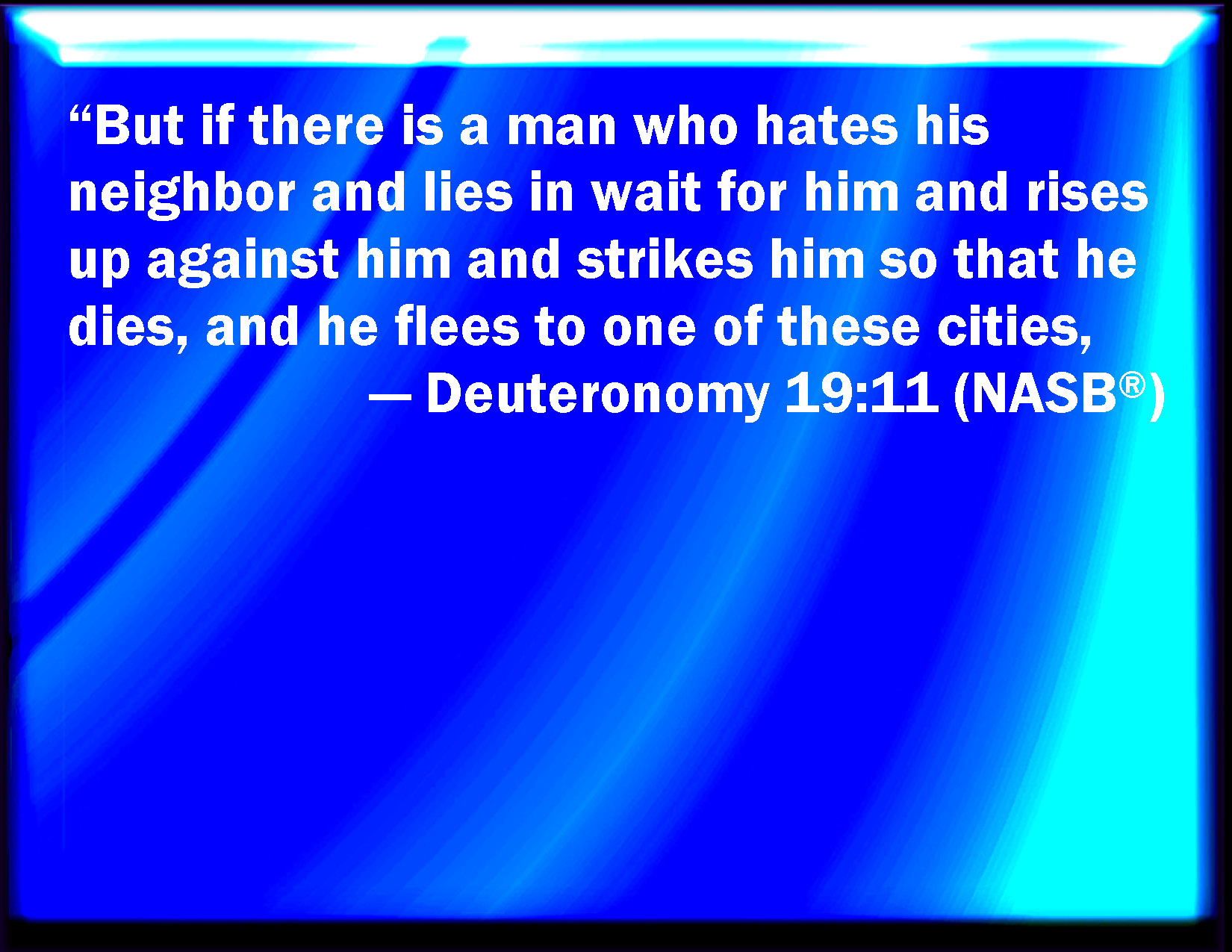 Bible Verse Slide Deuteronomy 19:11 But if any man hate his neighbor, and lie in wait for him, and rise up against him, and smite him mortally that he die, and flees into one of these cities: KJV: But if any man hate his neighbour, and lie in wait for him, and rise up against him, and smite him mortally that he die, and fleeth into one of these cities: DRB: But if any man hating his neighbour, lie in wait for his life, and rise and strike him, and he die, and he flee to one of the cities aforesaid, DBT: But if a man hate his neighbour, and lie in wait for him, and rise up against him, and smite him mortally that he die, and he flee into one of these cities, ERV: But if any man hate his neighbour, and lie in wait for him, and rise up against him, and smite him mortally that he die; and he flee into one of these cities: WBT: But if any man shall hate his neighbor, and lie in wait for him, and rise up against him, and smite him mortally, that he dieth, and he shall flee into one of these cities: WEB: But if any man hates his neighbor, and lies in wait for him, and rises up against him, and strikes him mortally so that he dies, and he flees into one of these cities; YLT: And when a man is hating his neighbour, and hath lain in wait for him, and risen against him, and smitten him — the life, and he hath died, and he hath fled unto one of these cities,Links Deuteronomy 19:11 NIV • Deuteronomy 19:11 NLT • Deuteronomy 19:11 ESV • Deuteronomy 19:11 NASB • Deuteronomy 19:11 KJV • Deuteronomy 19:11 Interlinear • Deuteronomy 19:11 Commentaries • Deuteronomy 19:11 Parallel Texts • Deuteronomy 19:11 Bible Apps • Deuteronomy 19:11 Parallel • Bible Hub |