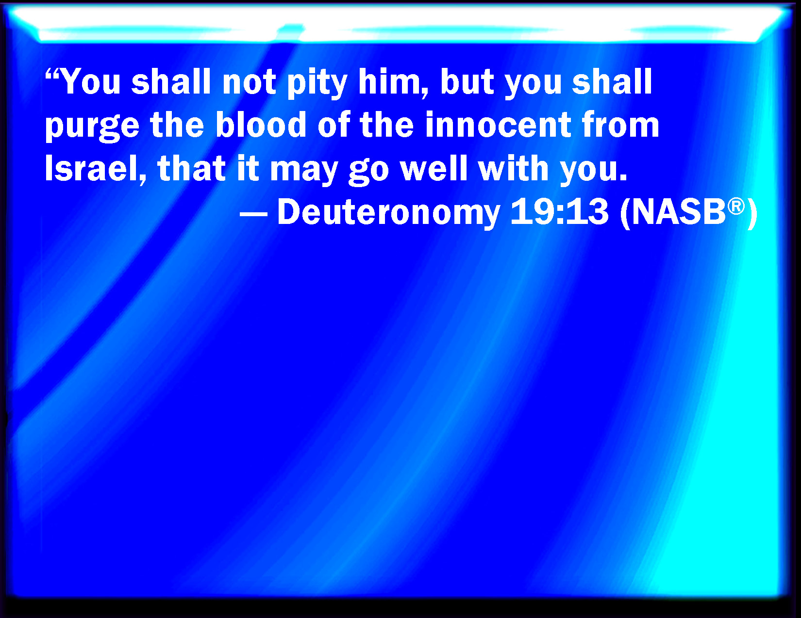 Bible Verse Slide Deuteronomy 19:13 Your eye shall not pity him, but you shall put away the guilt of innocent blood from Israel, that it may go well with you. KJV: Thine eye shall not pity him, but thou shalt put away the guilt of innocent blood from Israel, that it may go well with thee. DRB: Thou shalt not pity him, and thou shalt take away the guilt of innocent blood out of Israel, that it may be well with thee. DBT: Thine eye shall not spare him; and thou shalt put away innocent blood from Israel, that it may be well with thee. ERV: Thine eye shall not pity him, but thou shalt put away the innocent blood from Israel, that it may go well with thee. WBT: Thy eye shall not pity him, but thou shall remove the guilt of innocent blood from Israel, that it may be well with thee. WEB: Your eye shall not pity him, but you shall put away the innocent blood from Israel, that it may go well with you. YLT: thine eye hath no pity on him, and thou hast put away the innocent blood from Israel, and it is well with thee.Links Deuteronomy 19:13 NIV • Deuteronomy 19:13 NLT • Deuteronomy 19:13 ESV • Deuteronomy 19:13 NASB • Deuteronomy 19:13 KJV • Deuteronomy 19:13 Interlinear • Deuteronomy 19:13 Commentaries • Deuteronomy 19:13 Parallel Texts • Deuteronomy 19:13 Bible Apps • Deuteronomy 19:13 Parallel • Bible Hub |