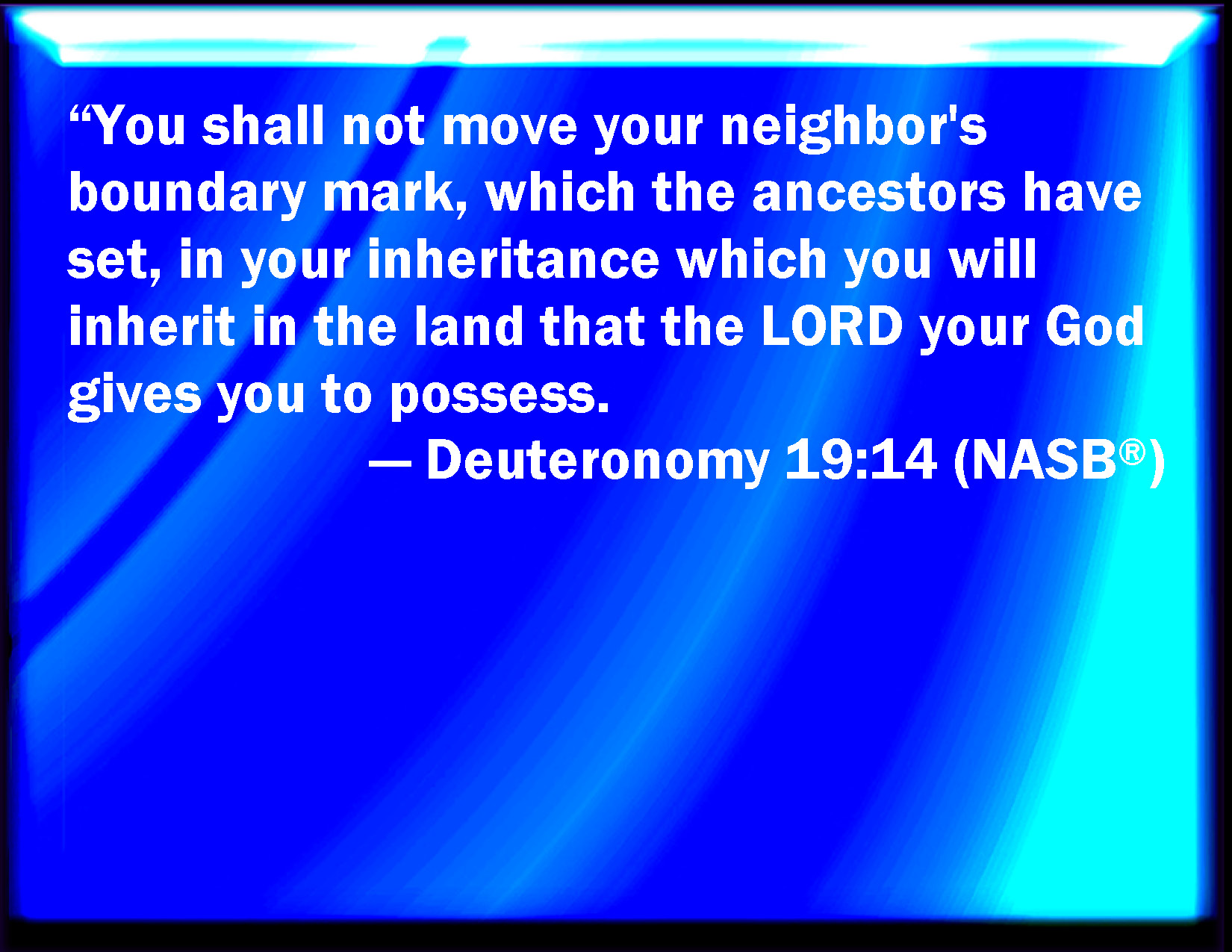 Bible Verse Slide Deuteronomy 19:14 You shall not remove your neighbor's landmark, which they of old time have set in your inheritance, which you shall inherit in the land that the LORD your God gives you to possess it. KJV: Thou shalt not remove thy neighbour's landmark, which they of old time have set in thine inheritance, which thou shalt inherit in the land that the LORD thy God giveth thee to possess it. DRB: Thou shalt not take nor remove thy neighbour's landmark, which thy predecessors have set in thy possession. which the Lord thy God will give thee in the land that thou shalt receive to possess. DBT: Thou shalt not remove thy neighbour's landmark, which they of old time have fixed in thine inheritance, which thou shalt inherit in the land which Jehovah thy God giveth thee to possess. ERV: Thou shalt not remove thy neighbour's landmark, which they of old time have set, in thine inheritance which thou shalt inherit, in the land that the LORD thy God giveth thee to possess it. WBT: Thou shalt not remove thy neighbor's landmark, which they of old time have set in thy inheritance, which thou shalt inherit in the land that the LORD thy God giveth thee to possess it. WEB: You shall not remove your neighbor's landmark, which they of old time have set, in your inheritance which you shall inherit, in the land that Yahweh your God gives you to possess it. YLT: 'Thou dost not remove a border of thy neighbour, which they of former times have made, in thine inheritance, which thou dost inherit in the land which Jehovah thy God is giving to thee to possess it.Links Deuteronomy 19:14 NIV • Deuteronomy 19:14 NLT • Deuteronomy 19:14 ESV • Deuteronomy 19:14 NASB • Deuteronomy 19:14 KJV • Deuteronomy 19:14 Interlinear • Deuteronomy 19:14 Commentaries • Deuteronomy 19:14 Parallel Texts • Deuteronomy 19:14 Bible Apps • Deuteronomy 19:14 Parallel • Bible Hub |