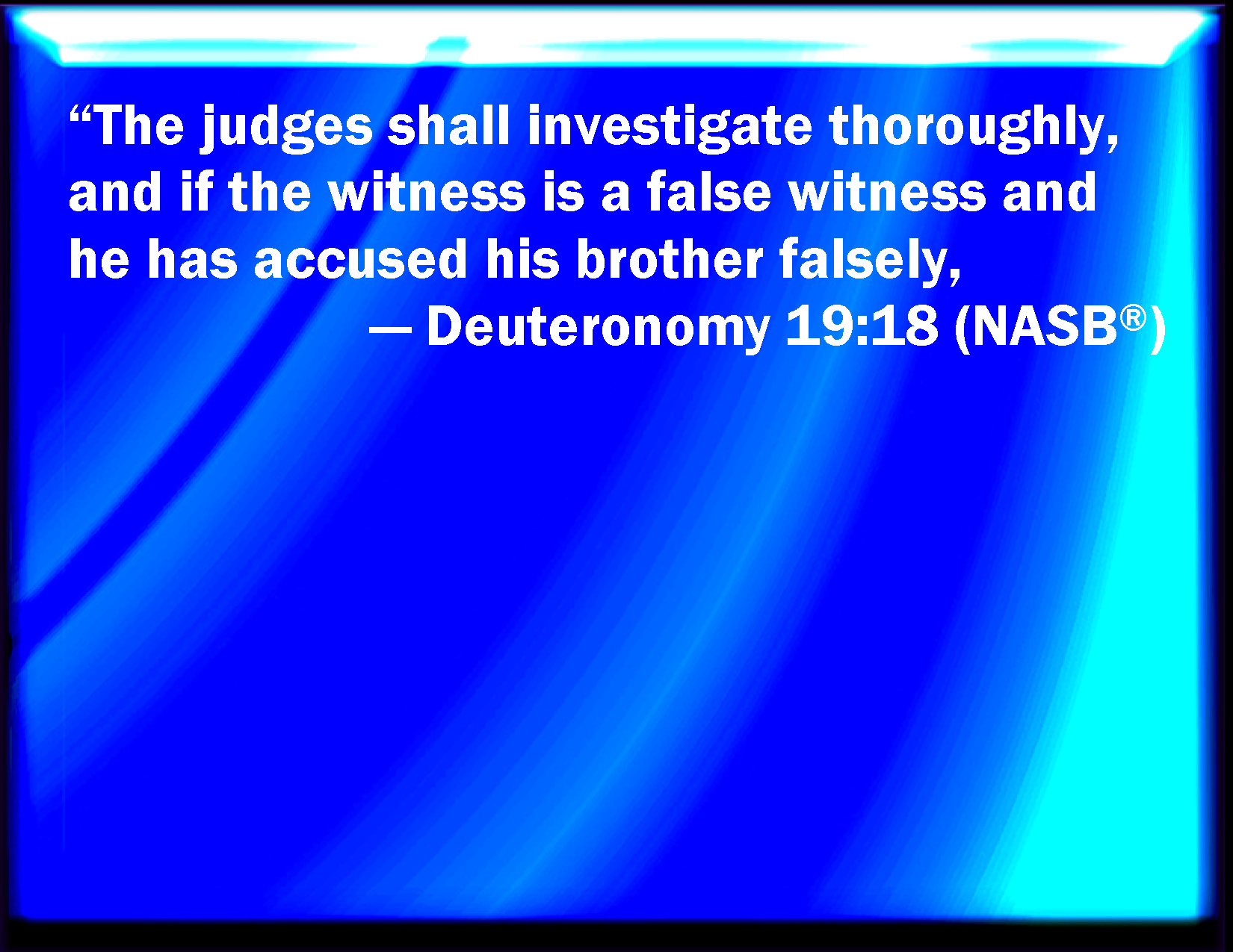 Bible Verse Slide Deuteronomy 19:18 And the judges shall make diligent inquisition: and, behold, if the witness be a false witness, and has testified falsely against his brother; KJV: And the judges shall make diligent inquisition: and, behold, if the witness be a false witness, and hath testified falsely against his brother; DRB: And when after most diligent inquisition, they shall find that the false witness hath told a lie against his brother: DBT: and the judges shall make thorough inquiry; and if the witness be a false witness, and he have testified falsely against his brother, ERV: and the judges shall make diligent inquisition: and, behold, if the witness be a false witness, and hath testified falsely against his brother; WBT: And the judges shall make diligent inquisition: and behold, if the witness is a false witness, and hath testified falsely against his brother; WEB: and the judges shall make diligent inquisition: and, behold, if the witness is a false witness, and has testified falsely against his brother; YLT: and the judges have searched diligently, and lo, the witness is a false witness, a falsehood he hath testified against his brother:Links Deuteronomy 19:18 NIV • Deuteronomy 19:18 NLT • Deuteronomy 19:18 ESV • Deuteronomy 19:18 NASB • Deuteronomy 19:18 KJV • Deuteronomy 19:18 Interlinear • Deuteronomy 19:18 Commentaries • Deuteronomy 19:18 Parallel Texts • Deuteronomy 19:18 Bible Apps • Deuteronomy 19:18 Parallel • Bible Hub |