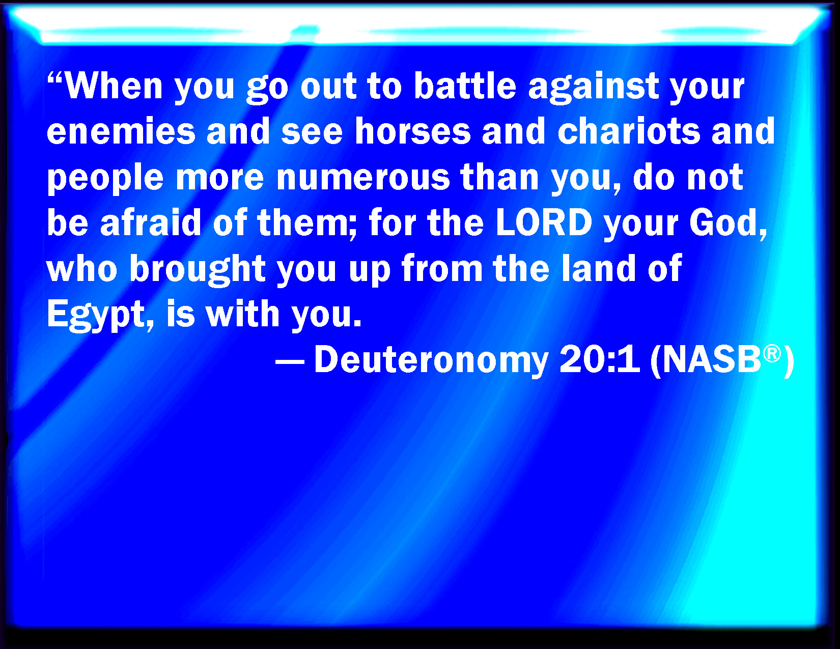 Bible Verse Slide Deuteronomy 20:1 When you go out to battle against your enemies, and see horses, and chariots, and a people more than you, be not afraid of them: for the LORD your God is with you, which brought you up out of the land of Egypt. KJV: When thou goest out to battle against thine enemies, and seest horses, and chariots, and a people more than thou, be not afraid of them: for the LORD thy God is with thee, which brought thee up out of the land of Egypt. DRB: If thou go out to war against thy enemies, and see horsemen and chariots, and the numbers of the enemy's army greater than thine, thou shalt not fear them: because the Lord thy God is with thee, who brought thee out of the land of Egypt. DBT: When thou goest out to war against thine enemies, and seest horses, and chariots, and a people more numerous than thou, thou shalt not fear them; for Jehovah thy God is with thee, who brought thee up out of the land of Egypt. ERV: When thou goest forth to battle against thine enemies, and seest horses, and chariots, and a people more than thou, thou shalt not be afraid of them: for the LORD thy God is with thee, which brought thee up out of the land of Egypt. WBT: When thou goest out to battle against thy enemies, and seest horses, and chariots, and a people more than thou, be not afraid of them: for the LORD thy God is with thee, who brought thee out of the land of Egypt. WEB: When you go forth to battle against your enemies, and see horses, and chariots, [and] a people more than you, you shall not be afraid of them; for Yahweh your God is with you, who brought you up out of the land of Egypt. YLT: When thou goest out to battle against thine enemy, and hast seen horse and chariot — a people more numerous than thou — thou art not afraid of them, for Jehovah thy God is with thee, who is bringing thee up out of the land of Egypt;Links Deuteronomy 20:1 NIV • Deuteronomy 20:1 NLT • Deuteronomy 20:1 ESV • Deuteronomy 20:1 NASB • Deuteronomy 20:1 KJV • Deuteronomy 20:1 Interlinear • Deuteronomy 20:1 Commentaries • Deuteronomy 20:1 Parallel Texts • Deuteronomy 20:1 Bible Apps • Deuteronomy 20:1 Parallel • Bible Hub |