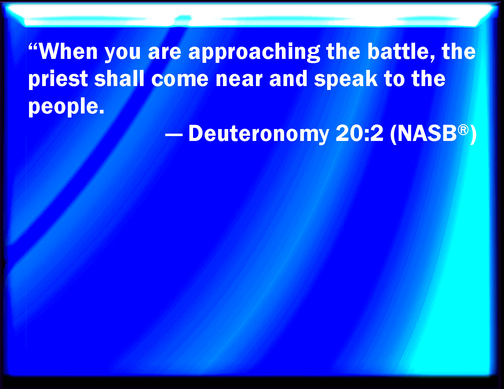 Bible Verse Slide Deuteronomy 20:2 And it shall be, when you are come near to the battle, that the priest shall approach and speak to the people, KJV: And it shall be, when ye are come nigh unto the battle, that the priest shall approach and speak unto the people, DRB: And when the battle is now at hand, the priest shall stand before the army, and shall speak to the people in this manner: DBT: And it shall be, when ye approach unto the battle, that the priest shall draw near and speak unto the people, ERV: And it shall be, when ye draw nigh unto the battle, that the priest shall approach and speak unto the people, WBT: And it shall be when ye are come nigh to the battle, that the priest shall approach and speak to the people, WEB: It shall be, when you draw near to the battle, that the priest shall approach and speak to the people, YLT: and it hath been, in your drawing near unto the battle, that the priest hath come nigh, and spoken unto the people,Links Deuteronomy 20:2 NIV • Deuteronomy 20:2 NLT • Deuteronomy 20:2 ESV • Deuteronomy 20:2 NASB • Deuteronomy 20:2 KJV • Deuteronomy 20:2 Interlinear • Deuteronomy 20:2 Commentaries • Deuteronomy 20:2 Parallel Texts • Deuteronomy 20:2 Bible Apps • Deuteronomy 20:2 Parallel • Bible Hub |