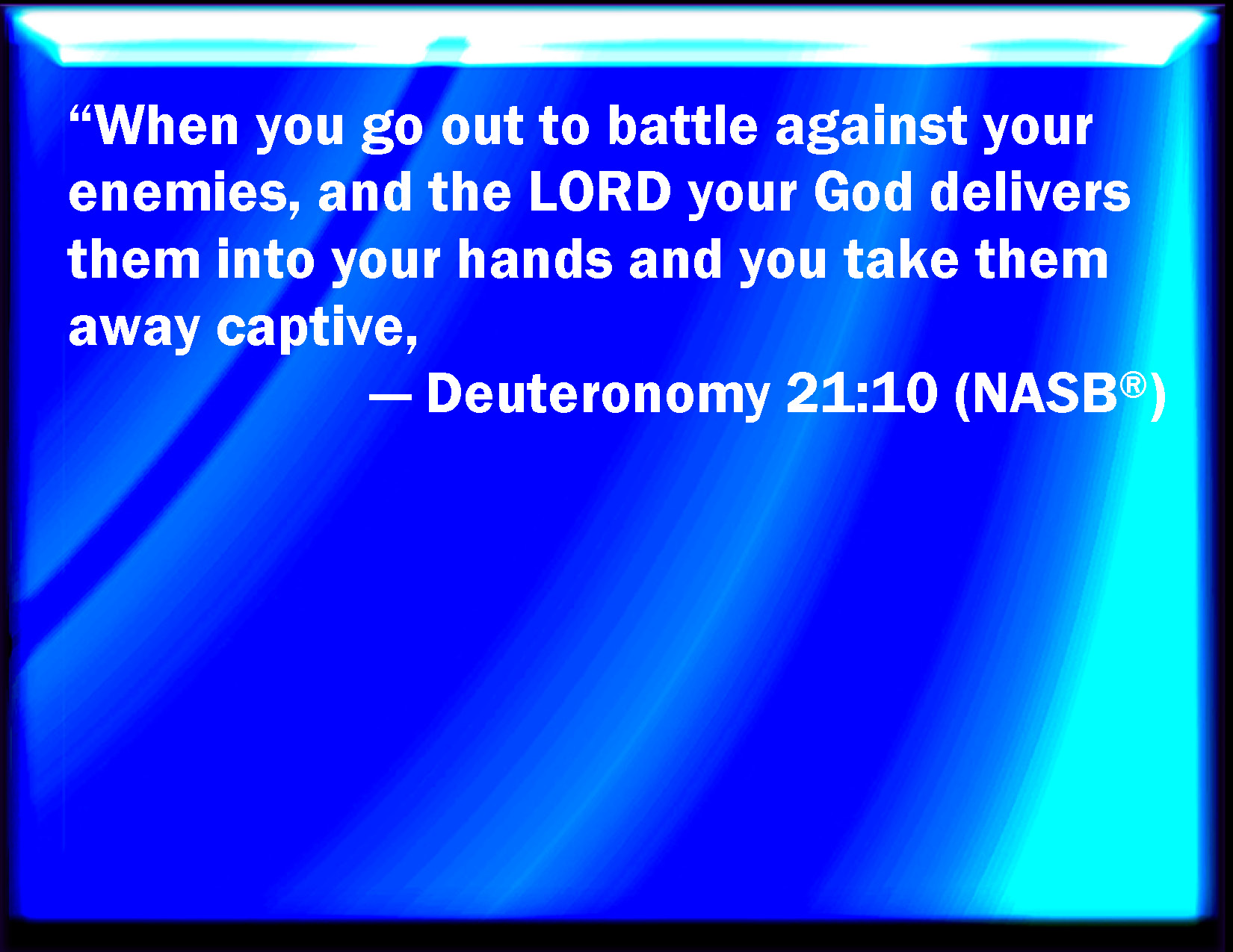 Bible Verse Slide Deuteronomy 21:10 When you go forth to war against your enemies, and the LORD your God has delivered them into your hands, and you have taken them captive, KJV: When thou goest forth to war against thine enemies, and the LORD thy God hath delivered them into thine hands, and thou hast taken them captive, DRB: If thou go out to fight against thy enemies, and the Lord thy God deliver them into thy hand, and thou lead them away captives, DBT: When thou goest forth to war against thine enemies, and Jehovah thy God delivereth them into thy hands, and thou hast taken captives of them, ERV: When thou goest forth to battle against thine enemies, and the LORD thy God delivereth them into thine hands, and thou carriest them away captive, WBT: When thou goest forth to war against thy enemies, and the LORD thy God hath delivered them into thy hands, and thou hast taken them captive, WEB: When you go forth to battle against your enemies, and Yahweh your God delivers them into your hands, and you carry them away captive, YLT: 'When thou goest out to battle against thine enemies, and Jehovah thy God hath given them into thy hand, and thou hast taken captive its captivity,Links Deuteronomy 21:10 NIV • Deuteronomy 21:10 NLT • Deuteronomy 21:10 ESV • Deuteronomy 21:10 NASB • Deuteronomy 21:10 KJV • Deuteronomy 21:10 Interlinear • Deuteronomy 21:10 Commentaries • Deuteronomy 21:10 Parallel Texts • Deuteronomy 21:10 Bible Apps • Deuteronomy 21:10 Parallel • Bible Hub |