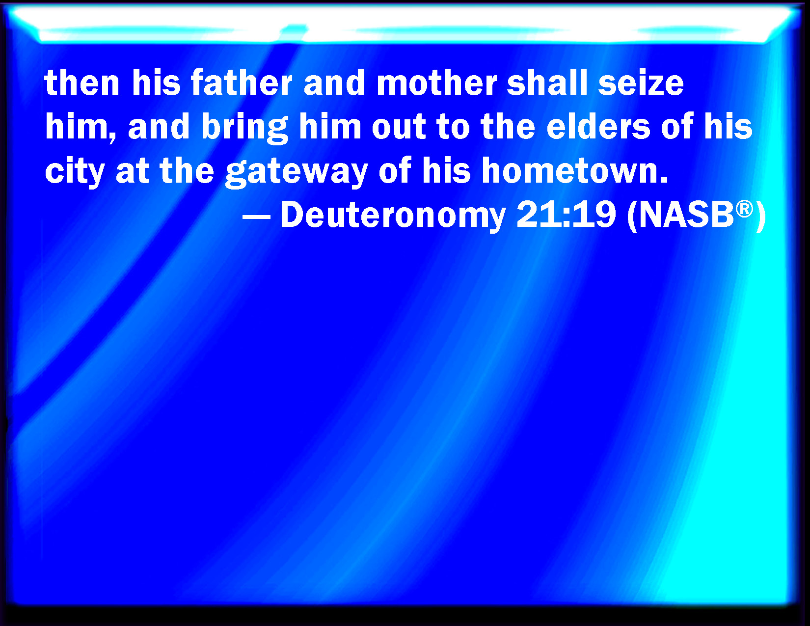 Bible Verse Slide Deuteronomy 21:19 Then shall his father and his mother lay hold on him, and bring him out to the elders of his city, and to the gate of his place; KJV: Then shall his father and his mother lay hold on him, and bring him out unto the elders of his city, and unto the gate of his place; DRB: They shall take him and bring him to the ancients of his city, and to the gate of judgment, DBT: then shall his father and his mother lay hold on him, and bring him out unto the elders of his city, and unto the gate of his place; ERV: then shall his father and his mother lay hold on him, and bring him out unto the elders of his city, and unto the gate of his place; WBT: Then shall his father and his mother lay hold on him, and bring him out to the elders of his city, and to the gate of his place; WEB: then shall his father and his mother lay hold on him, and bring him out to the elders of his city, and to the gate of his place; YLT: then laid hold on him have his father and his mother, and they have brought him out unto the elders of his city, and unto the gate of his place,Links Deuteronomy 21:19 NIV • Deuteronomy 21:19 NLT • Deuteronomy 21:19 ESV • Deuteronomy 21:19 NASB • Deuteronomy 21:19 KJV • Deuteronomy 21:19 Interlinear • Deuteronomy 21:19 Commentaries • Deuteronomy 21:19 Parallel Texts • Deuteronomy 21:19 Bible Apps • Deuteronomy 21:19 Parallel • Bible Hub |