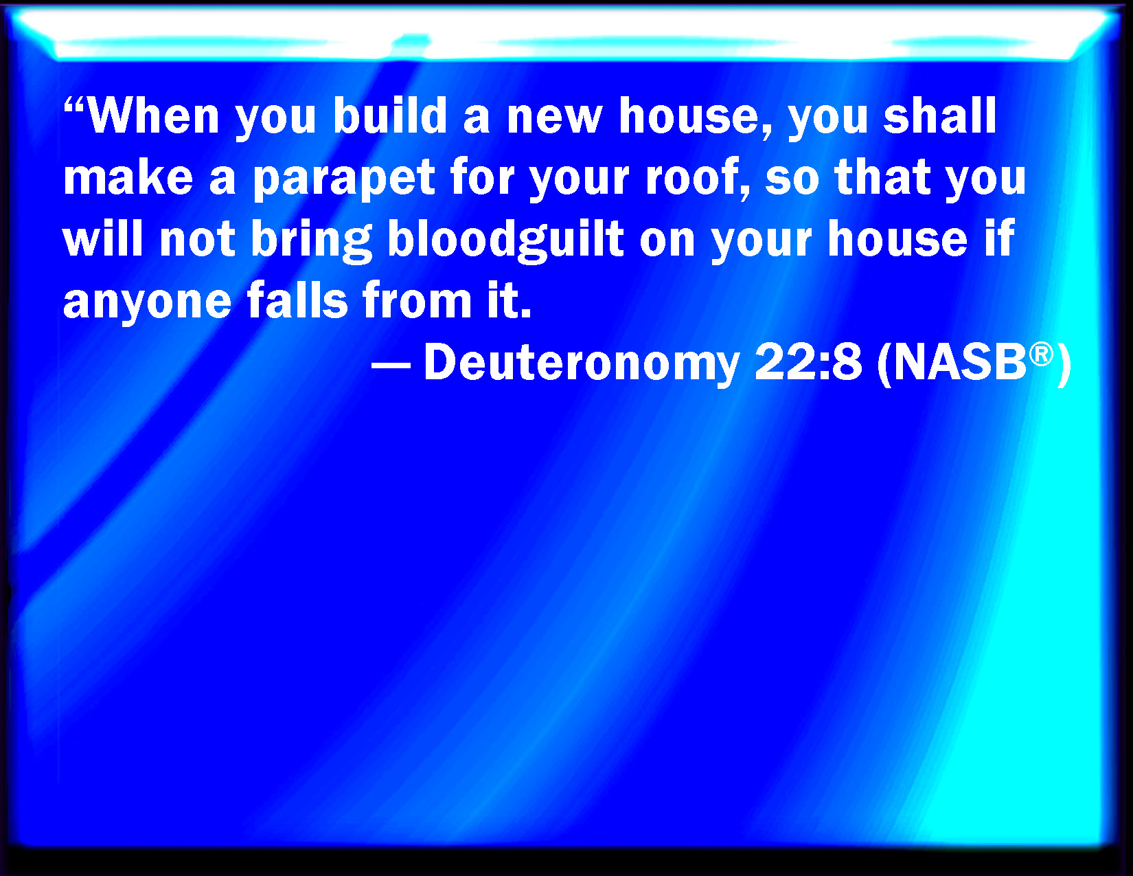 Bible Verse Slide Deuteronomy 22:8 When you build a new house, then you shall make a battlement for your roof, that you bring not blood on your house, if any man fall from there. KJV: When thou buildest a new house, then thou shalt make a battlement for thy roof, that thou bring not blood upon thine house, if any man fall from thence. DRB: When thou buildest a new house, thou shalt make a battlement to the roof round about: lest blood be shed in thy house, and thou be guilty, if any one slip, and fall down headlong. DBT: When thou buildest a new house, thou shalt make a parapet for thy roof, that thou bring not blood upon thy house, if any one should in any wise fall from it. ERV: When thou buildest a new house, then thou shalt make a battlement for thy roof, that thou bring not blood upon thine house, if any man fall from thence. WBT: When thou buildest a new house, then thou shalt make a battlement for thy roof, that thou mayest not bring blood upon thy house, if any man shall fall from thence. WEB: When you build a new house, then you shall make a battlement for your roof, that you don't bring blood on your house, if any man fall from there. YLT: 'When thou buildest a new house, then thou hast made a parapet to thy roof, and thou dost not put blood on thy house when one falleth from it.Links Deuteronomy 22:8 NIV • Deuteronomy 22:8 NLT • Deuteronomy 22:8 ESV • Deuteronomy 22:8 NASB • Deuteronomy 22:8 KJV • Deuteronomy 22:8 Interlinear • Deuteronomy 22:8 Commentaries • Deuteronomy 22:8 Parallel Texts • Deuteronomy 22:8 Bible Apps • Deuteronomy 22:8 Parallel • Bible Hub |