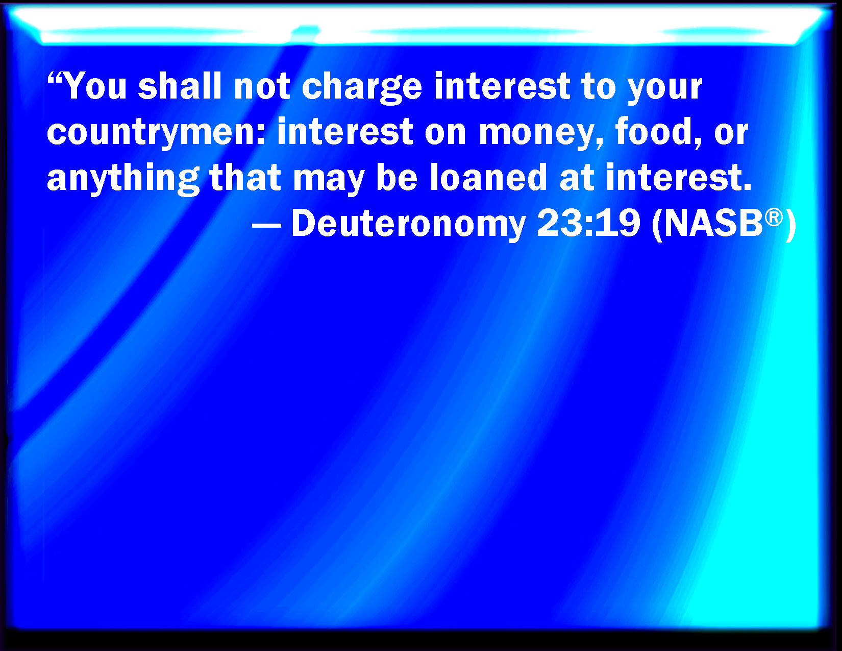 Bible Verse Slide Deuteronomy 23:19 You shall not lend on usury to your brother; usury of money, usury of victuals, usury of any thing that is lent on usury: KJV: Thou shalt not lend upon usury to thy brother; usury of money, usury of victuals, usury of any thing that is lent upon usury: DRB: Thou shalt not lend to thy brother money to usury, nor corn, nor any other thing: DBT: Thou shalt take no interest of thy brother, interest of money, interest of victuals, interest of anything that can be lent upon interest: ERV: Thou shalt not lend upon usury to thy brother; usury of money, usury of victuals, usury of any thing that is lent upon usury: WBT: Thou shalt not lend upon interest to thy brother; interest of money, interest of victuals, interest of any thing that is lent upon interest: WEB: You shall not lend on interest to your brother; interest of money, interest of food, interest of anything that is lent on interest: YLT: 'Thou dost not lend in usury to thy brother; usury of money, usury of food, usury of anything which is lent on usury.Links Deuteronomy 23:19 NIV • Deuteronomy 23:19 NLT • Deuteronomy 23:19 ESV • Deuteronomy 23:19 NASB • Deuteronomy 23:19 KJV • Deuteronomy 23:19 Interlinear • Deuteronomy 23:19 Commentaries • Deuteronomy 23:19 Parallel Texts • Deuteronomy 23:19 Bible Apps • Deuteronomy 23:19 Parallel • Bible Hub |