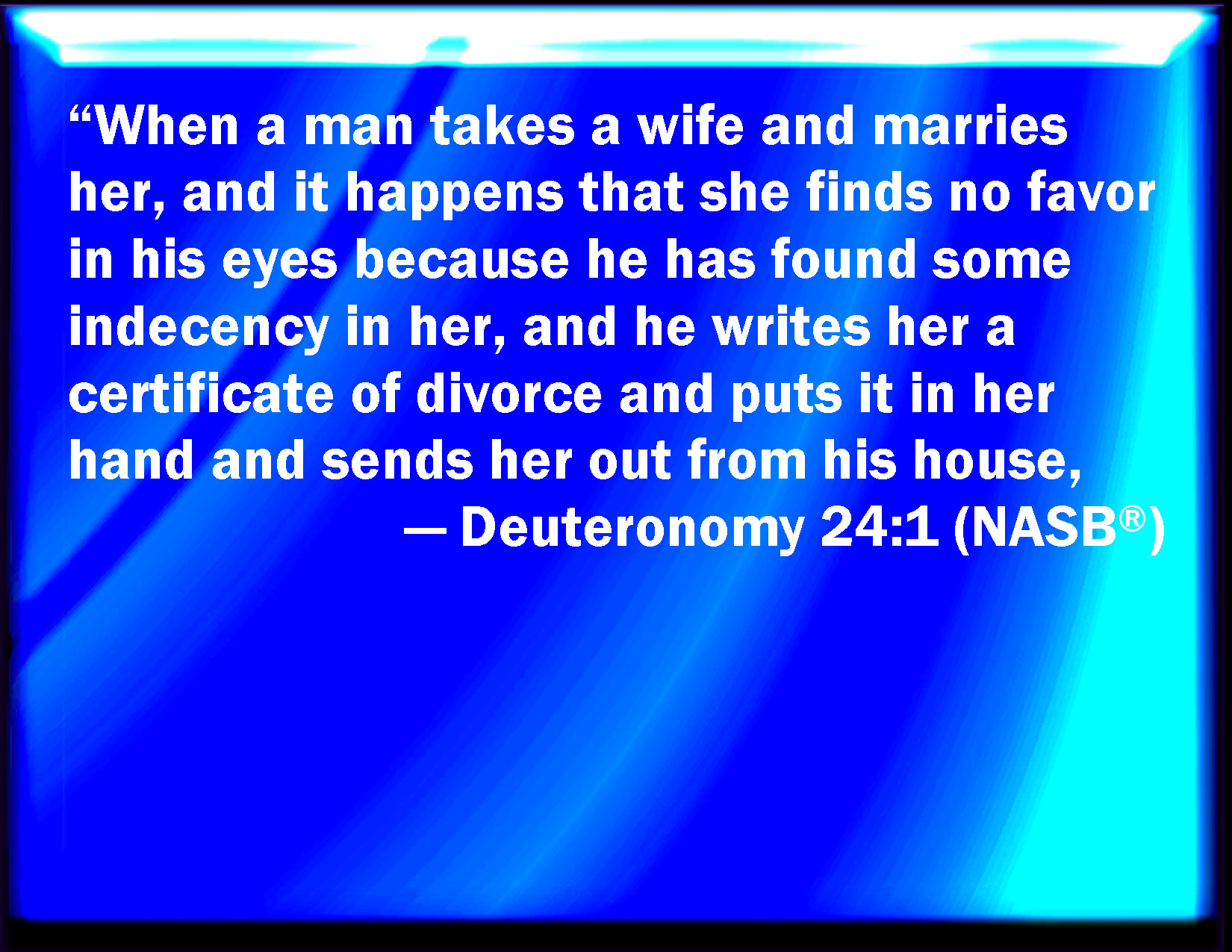 Bible Verse Slide Deuteronomy 24:1 When a man has taken a wife, and married her, and it come to pass that she find no favor in his eyes, because he has found some uncleanness in her: then let him write her a bill of divorce, and give it in her hand, and send her out of his house. KJV: When a man hath taken a wife, and married her, and it come to pass that she find no favour in his eyes, because he hath found some uncleanness in her: then let him write her a bill of divorcement, and give it in her hand, and send her out of his house. DRB: If a man take a wife, and have her, and she find not favour in his eyes, for some uncleanness: he shall write a bill of divorce, and shall give it in her hand, and send her out of his house. DBT: When a man taketh a wife, and marrieth her, it shall be if she find no favour in his eyes, because he hath found some unseemly thing in her, that he shall write her a letter of divorce, and give it into her hand, and send her out of his house. ERV: When a man taketh a wife, and marrieth her, then it shall be, if she find no favour in his eyes, because he hath found some unseemly thing in her, that he shall write her a bill of divorcement, and give it in her hand, and send her out of his house. WBT: When a man hath taken a wife, and married her, and it shall come to pass that she findeth no favor in his eyes, because he hath found some uncleanness in her: then let him write her a bill of divorcement, and give it in her hand, and send her out of his house. WEB: When a man takes a wife, and marries her, then it shall be, if she find no favor in his eyes, because he has found some unseemly thing in her, that he shall write her a bill of divorce, and give it in her hand, and send her out of his house. YLT: When a man doth take a wife, and hath married her, and it hath been, if she doth not find grace in his eyes (for he hath found in her nakedness of anything), and he hath written for her a writing of divorce, and given it into her hand, and sent her out of his house,Links Deuteronomy 24:1 NIV • Deuteronomy 24:1 NLT • Deuteronomy 24:1 ESV • Deuteronomy 24:1 NASB • Deuteronomy 24:1 KJV • Deuteronomy 24:1 Interlinear • Deuteronomy 24:1 Commentaries • Deuteronomy 24:1 Parallel Texts • Deuteronomy 24:1 Bible Apps • Deuteronomy 24:1 Parallel • Bible Hub |