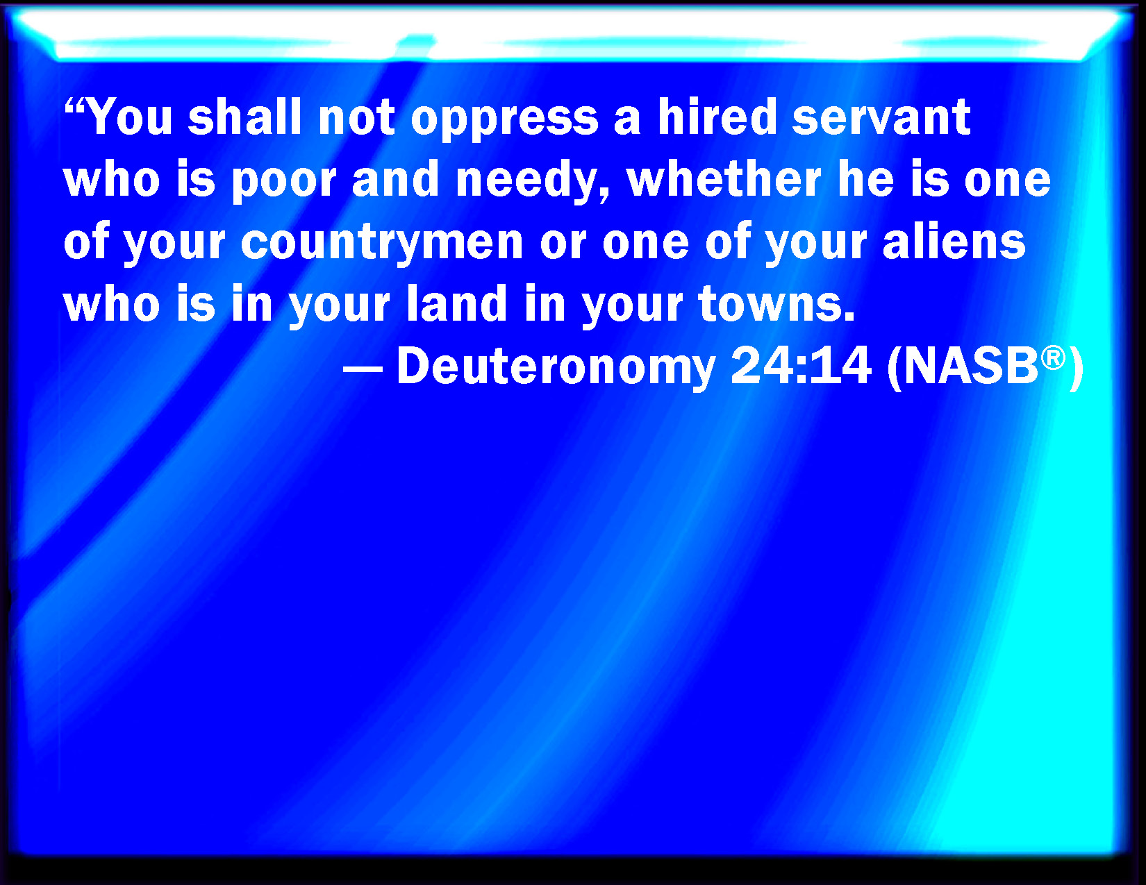 Bible Verse Slide Deuteronomy 24:14 You shall not oppress an hired servant that is poor and needy, whether he be of your brothers, or of your strangers that are in your land within your gates: KJV: Thou shalt not oppress an hired servant that is poor and needy, whether he be of thy brethren, or of thy strangers that are in thy land within thy gates: DRB: Thou shalt not refuse the hire of the needy, and the poor, whether he be thy brother, or a stranger that dwelleth with thee in the land, and is within thy gates: DBT: Thou shalt not oppress a hired servant who is poor and needy of thy brethren, or of thy sojourners who are in thy land within thy gates: ERV: Thou shalt not oppress an hired servant that is poor and needy, whether he be of thy brethren, or of thy strangers that are in thy land within thy gates: WBT: Thou shalt not oppress a hired servant that is poor and needy, whether he is of thy brethren, or of thy strangers that are in thy land within thy gates: WEB: You shall not oppress a hired servant who is poor and needy, whether he be of your brothers, or of your foreigners who are in your land within your gates: YLT: 'Thou dost not oppress a hireling, poor and needy, of thy brethren or of thy sojourner who is in thy land within thy gates;Links Deuteronomy 24:14 NIV • Deuteronomy 24:14 NLT • Deuteronomy 24:14 ESV • Deuteronomy 24:14 NASB • Deuteronomy 24:14 KJV • Deuteronomy 24:14 Interlinear • Deuteronomy 24:14 Commentaries • Deuteronomy 24:14 Parallel Texts • Deuteronomy 24:14 Bible Apps • Deuteronomy 24:14 Parallel • Bible Hub |