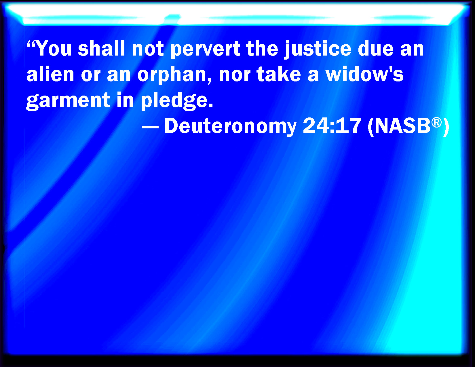 Bible Verse Slide Deuteronomy 24:17 You shall not pervert the judgment of the stranger, nor of the fatherless; nor take a widow's raiment to pledge: KJV: Thou shalt not pervert the judgment of the stranger, nor of the fatherless; nor take a widow's raiment to pledge: DRB: Thou shalt not pervert the judgment of the stranger nor of the fatherless, neither shalt thou take away the widow's raiment for a pledge. DBT: Thou shalt not pervert the judgment of the stranger, or of the fatherless; and thou shalt not take in pledge a widow's garment. ERV: Thou shalt not wrest the judgment of the stranger, nor of the fatherless; nor take the widow's raiment to pledge: WBT: Thou shalt not pervert the judgment of the stranger, nor of the fatherless, nor take a widow's raiment for a pledge: WEB: You shall not wrest the justice [due] to the foreigner, [or] to the fatherless, nor take the widow's clothing to pledge; YLT: 'Thou dost not turn aside the judgment of a fatherless sojourner, nor take in pledge the garment of a widow;Links Deuteronomy 24:17 NIV • Deuteronomy 24:17 NLT • Deuteronomy 24:17 ESV • Deuteronomy 24:17 NASB • Deuteronomy 24:17 KJV • Deuteronomy 24:17 Interlinear • Deuteronomy 24:17 Commentaries • Deuteronomy 24:17 Parallel Texts • Deuteronomy 24:17 Bible Apps • Deuteronomy 24:17 Parallel • Bible Hub |