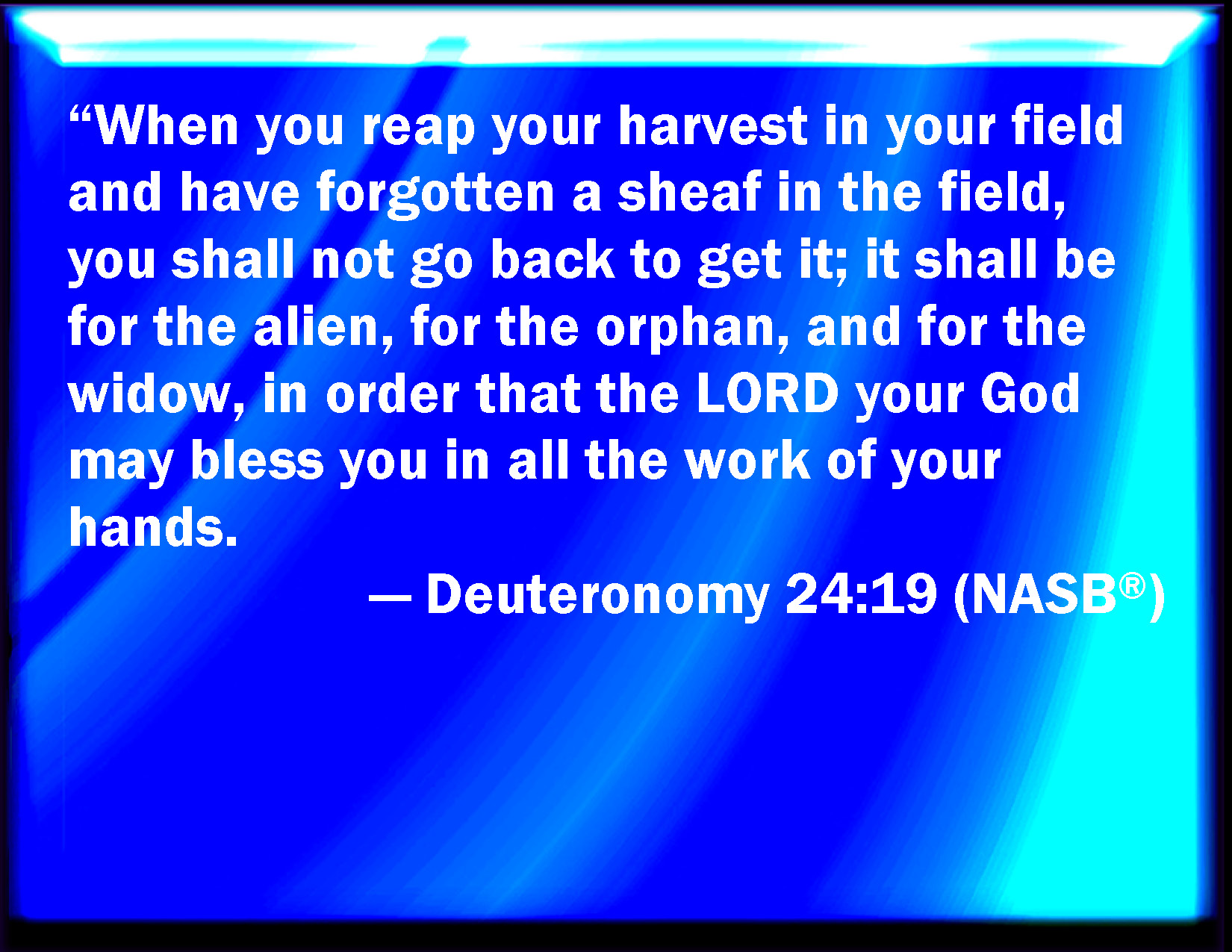 Bible Verse Slide Deuteronomy 24:19 When you cut down your harvest in your field, and have forgot a sheaf in the field, you shall not go again to fetch it: it shall be for the stranger, for the fatherless, and for the widow: that the LORD your God may bless you in all the work of your hands. KJV: When thou cuttest down thine harvest in thy field, and hast forgot a sheaf in the field, thou shalt not go again to fetch it: it shall be for the stranger, for the fatherless, and for the widow: that the LORD thy God may bless thee in all the work of thine hands. DRB: When thou hast reaped the corn in thy field, and hast forgot and left a sheaf, thou shalt not return to take it away: but thou shalt suffer the stranger, and the fatherless and the widow to tabs it away: that the Lord thy God may bless thee in all the works of thy hands. DBT: When thou reapest thy harvest in thy field, and forgettest a sheaf in the field, thou shalt not return to fetch it; it shall be for the stranger, for the fatherless, and for the widow; that Jehovah thy God may bless thee in all the work of thy hands. ERV: When thou reapest thine harvest in thy field, and hast forgot a sheaf in the field, thou shalt not go again to fetch it: it shall be for the stranger, for the fatherless, and for the widow: that the LORD thy God may bless thee in all the work of thine hands. WBT: When thou cuttest down thy harvest in thy field, and hast forgot a sheaf in the field, thou shalt not go again to fetch it: it shall be for the stranger, for the fatherless, and for the widow: that the LORD thy God may bless thee in all the work of thy hands. WEB: When you reap your harvest in your field, and have forgot a sheaf in the field, you shall not go again to get it: it shall be for the foreigner, for the fatherless, and for the widow; that Yahweh your God may bless you in all the work of your hands. YLT: 'When thou reapest thy harvest in thy field, and hast forgotten a sheaf in a field, thou dost not turn back to take it; to the sojourner, to the fatherless, and to the widow, it is; so that Jehovah thy God doth bless thee in all the work of thy hands.Links Deuteronomy 24:19 NIV • Deuteronomy 24:19 NLT • Deuteronomy 24:19 ESV • Deuteronomy 24:19 NASB • Deuteronomy 24:19 KJV • Deuteronomy 24:19 Interlinear • Deuteronomy 24:19 Commentaries • Deuteronomy 24:19 Parallel Texts • Deuteronomy 24:19 Bible Apps • Deuteronomy 24:19 Parallel • Bible Hub |