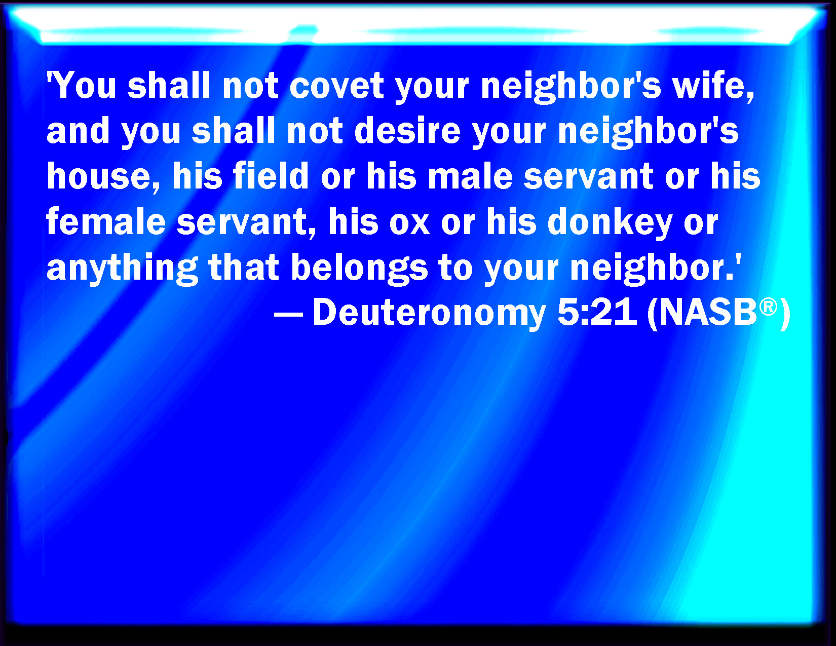 Bible Verse Slide Deuteronomy 5:21 Neither shall you desire your neighbor's wife, neither shall you covet your neighbor's house, his field, or his manservant, or his maidservant, his ox, or his ass, or any thing that is your neighbor's. KJV: Neither shalt thou desire thy neighbour's wife, neither shalt thou covet thy neighbour's house, his field, or his manservant, or his maidservant, his ox, or his ass, or any thing that is thy neighbour's. DRB: Thou shalt not covet thy neighbour's wife: nor his house, nor his field, nor his manservant, nor his maidservant, nor his ox, nor his ass, nor any thing that is his. DBT: Neither shalt thou desire thy neighbour's wife, neither shalt thou covet thy neighbour's house, his field, nor his bondman, nor his handmaid, his ox, nor his ass, nor anything that is thy neighbour's. ERV: Neither shalt thou covet thy neighbour's wife; neither shalt thou desire thy neighbour's house, his field, or his manservant, or his maidservant, his ox, or his ass, or any thing that is thy neighbour's. WBT: Neither shalt thou desire thy neighbor's wife, neither shalt thou covet thy neighbor's house, his field, or his man-servant, or his maid-servant, his ox, or his ass, or any thing that is thy neighbor's. WEB: "Neither shall you covet your neighbor's wife; neither shall you desire your neighbor's house, his field, or his male servant, or his female servant, his ox, or his donkey, or anything that is your neighbor's." YLT: Thou dost not desire thy neighbour's wife; nor dost thou covet thy neighbour's house, his field, and his man-servant, and his handmaid, his ox, and his ass, and anything which is thy neighbour's.Links Deuteronomy 5:21 NIV • Deuteronomy 5:21 NLT • Deuteronomy 5:21 ESV • Deuteronomy 5:21 NASB • Deuteronomy 5:21 KJV • Deuteronomy 5:21 Interlinear • Deuteronomy 5:21 Commentaries • Deuteronomy 5:21 Parallel Texts • Deuteronomy 5:21 Bible Apps • Deuteronomy 5:21 Parallel • Bible Hub |