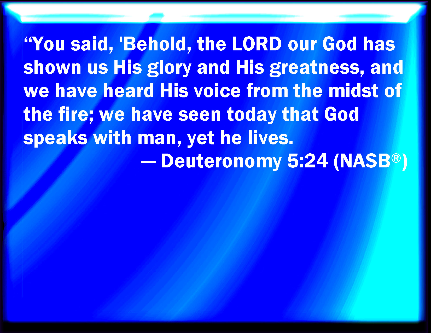 Bible Verse Slide Deuteronomy 5:24 And you said, Behold, the LORD our God has showed us his glory and his greatness, and we have heard his voice out of the middle of the fire: we have seen this day that God does talk with man, and he lives. KJV: And ye said, Behold, the LORD our God hath shewed us his glory and his greatness, and we have heard his voice out of the midst of the fire: we have seen this day that God doth talk with man, and he liveth. DRB: Behold the Lord our God hath shewn us his majesty and his greatness, we have heard his voice out of the midst of the fire, and have proved this day that God speaking with man, man hath lived. DBT: and ye said, Behold, Jehovah our God has shewn us his glory and his greatness, and we have heard his voice from the midst of the fire: we have seen this day that God talks with man, and he lives. ERV: and ye said, Behold, the LORD our God hath shewed us his glory and his greatness, and we have heard his voice out of the midst of the fire: we have seen this day that God doth speak with man, and he liveth. WBT: And ye said, Behold, the LORD our God hath shown us his glory and his greatness, and we have heard his voice from the midst of the fire: we have seen this day that God doth talk with man, and he liveth. WEB: and you said, "Behold, Yahweh our God has shown us his glory and his greatness, and we have heard his voice out of the midst of the fire: we have seen this day that God does speak with man, and he lives. YLT: and say, Lo, Jehovah our God hath shewed us His honour, and His greatness; and His voice we have heard out of the midst of the fire; this day we have seen that God doth speak with man — and he hath lived.Links Deuteronomy 5:24 NIV • Deuteronomy 5:24 NLT • Deuteronomy 5:24 ESV • Deuteronomy 5:24 NASB • Deuteronomy 5:24 KJV • Deuteronomy 5:24 Interlinear • Deuteronomy 5:24 Commentaries • Deuteronomy 5:24 Parallel Texts • Deuteronomy 5:24 Bible Apps • Deuteronomy 5:24 Parallel • Bible Hub |