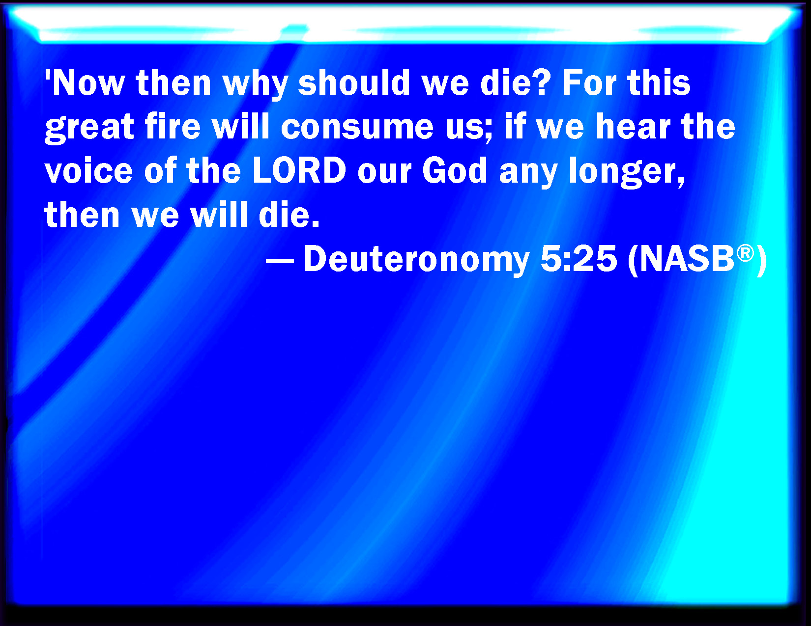 Bible Verse Slide Deuteronomy 5:25 Now therefore why should we die? for this great fire will consume us: if we hear the voice of the LORD our God any more, then we shall die. KJV: Now therefore why should we die? for this great fire will consume us: if we hear the voice of the LORD our God any more, then we shall die. DRB: Why shall we die therefore, and why shall this exceeding great Are consume us: for if we hear the voice of the Lord our God any more, we shall die. DBT: And now, why should we die? for this great fire will consume us. If we hear the voice of Jehovah our God any more, we shall die. ERV: Now therefore why should we die? for this great fire will consume us: if we hear the voice of the LORD our God any more, then we shall die. WBT: Now therefore why should we die? for this great fire will consume us: if we hear the voice of the LORD our God any more, then we shall die. WEB: Now therefore why should we die? For this great fire will consume us: if we hear the voice of Yahweh our God any more, then we shall die. YLT: And, now, why do we die? for consume us doth this great fire — if we add to hear the voice of Jehovah our God any more — then we have died.Links Deuteronomy 5:25 NIV • Deuteronomy 5:25 NLT • Deuteronomy 5:25 ESV • Deuteronomy 5:25 NASB • Deuteronomy 5:25 KJV • Deuteronomy 5:25 Interlinear • Deuteronomy 5:25 Commentaries • Deuteronomy 5:25 Parallel Texts • Deuteronomy 5:25 Bible Apps • Deuteronomy 5:25 Parallel • Bible Hub |