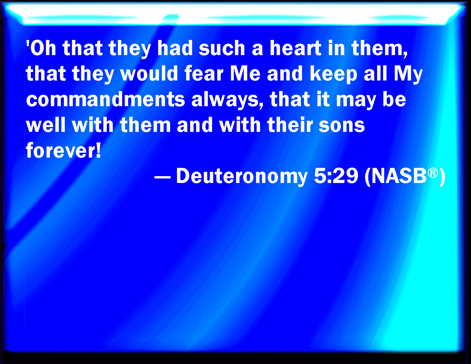 Bible Verse Slide Deuteronomy 5:29 O that there were such an heart in them, that they would fear me, and keep all my commandments always, that it might be well with them, and with their children for ever! KJV: O that there were such an heart in them, that they would fear me, and keep all my commandments always, that it might be well with them, and with their children for ever! DRB: Who shall give them to have such a mind, to fear me, and to keep all my commandments at all times, that it may be well with them and with their children for ever? DBT: Oh that there were such a heart in them, that they would fear me, and keep all my commandments continually, that it might be well with them and with their sons for ever! ERV: Oh that there were such an heart in them, that they would fear me, and keep all my commandments always, that it might be well with them, and with their children for ever! WBT: O that there were such a heart in them, that they would fear me, and keep all my commandments always, that it might be well with them, and with their children for ever! WEB: Oh that there were such a heart in them, that they would fear me, and keep all my commandments always, that it might be well with them, and with their children forever! YLT: O that their heart had been thus to them, to fear Me, and to keep My commands all the days, that it may be well with them, and with their sons — to the age!Links Deuteronomy 5:29 NIV • Deuteronomy 5:29 NLT • Deuteronomy 5:29 ESV • Deuteronomy 5:29 NASB • Deuteronomy 5:29 KJV • Deuteronomy 5:29 Interlinear • Deuteronomy 5:29 Commentaries • Deuteronomy 5:29 Parallel Texts • Deuteronomy 5:29 Bible Apps • Deuteronomy 5:29 Parallel • Bible Hub |