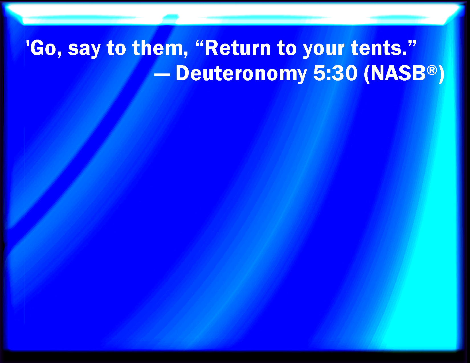 Bible Verse Slide Deuteronomy 5:30 Go say to them, Get you into your tents again. KJV: Go say to them, Get you into your tents again. DRB: Go and say to them: Return into your tents. DBT: Go, say unto them, Get you into your tents again. ERV: Go say to them, Return ye to your tents. WBT: Go, say to them, Return to your tents again. WEB: "Go tell them, Return to your tents. YLT: 'Go, say to them, Turn back for yourselves, to your tents;Links Deuteronomy 5:30 NIV • Deuteronomy 5:30 NLT • Deuteronomy 5:30 ESV • Deuteronomy 5:30 NASB • Deuteronomy 5:30 KJV • Deuteronomy 5:30 Interlinear • Deuteronomy 5:30 Commentaries • Deuteronomy 5:30 Parallel Texts • Deuteronomy 5:30 Bible Apps • Deuteronomy 5:30 Parallel • Bible Hub |