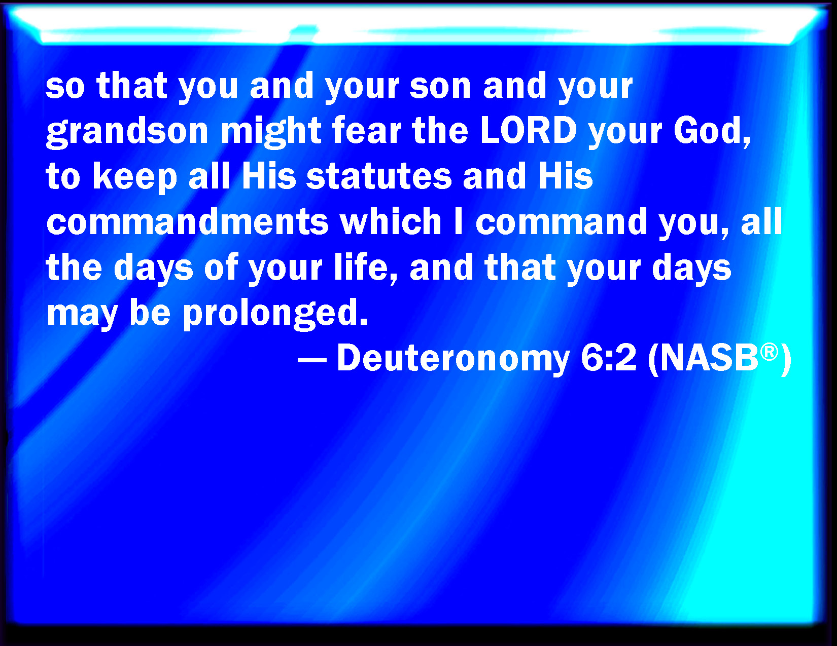 Bible Verse Slide Deuteronomy 6:2 That you might fear the LORD your God, to keep all his statutes and his commandments, which I command you, you, and your son, and your son's son, all the days of your life; and that your days may be prolonged. KJV: That thou mightest fear the LORD thy God, to keep all his statutes and his commandments, which I command thee, thou, and thy son, and thy son's son, all the days of thy life; and that thy days may be prolonged. DRB: That thou mayst fear the Lord thy God, and keep all his commandments and precepts, which I command thee, and thy sons, and thy grandsons, all the days of thy life, that thy days may be prolonged. DBT: that thou mayest fear Jehovah thy God, to keep all his statutes and his commandments which I command thee, thou, and thy son, and thy son's son, all the days of thy life; and that thy days may be prolonged. ERV: that thou mightest fear the LORD thy God, to keep all his statutes and his commandments, which I command thee, thou, and thy son, and thy son's son, all the days of thy life; and that thy days may be prolonged. WBT: That thou mayst fear the LORD thy God, to keep all his statutes and his commandments which I command thee, thou, and thy son, and thy son's son, all the days of thy life: and that thy days may be prolonged. WEB: that you might fear Yahweh your God, to keep all his statutes and his commandments, which I command you, you, and your son, and your son's son, all the days of your life; and that your days may be prolonged. YLT: so that thou dost fear Jehovah thy God, to keep all His statutes and His commands, which I am commanding thee, thou, and thy son, and thy son's son, all days of thy life, and so that thy days are prolonged.Links Deuteronomy 6:2 NIV • Deuteronomy 6:2 NLT • Deuteronomy 6:2 ESV • Deuteronomy 6:2 NASB • Deuteronomy 6:2 KJV • Deuteronomy 6:2 Interlinear • Deuteronomy 6:2 Commentaries • Deuteronomy 6:2 Parallel Texts • Deuteronomy 6:2 Bible Apps • Deuteronomy 6:2 Parallel • Bible Hub |