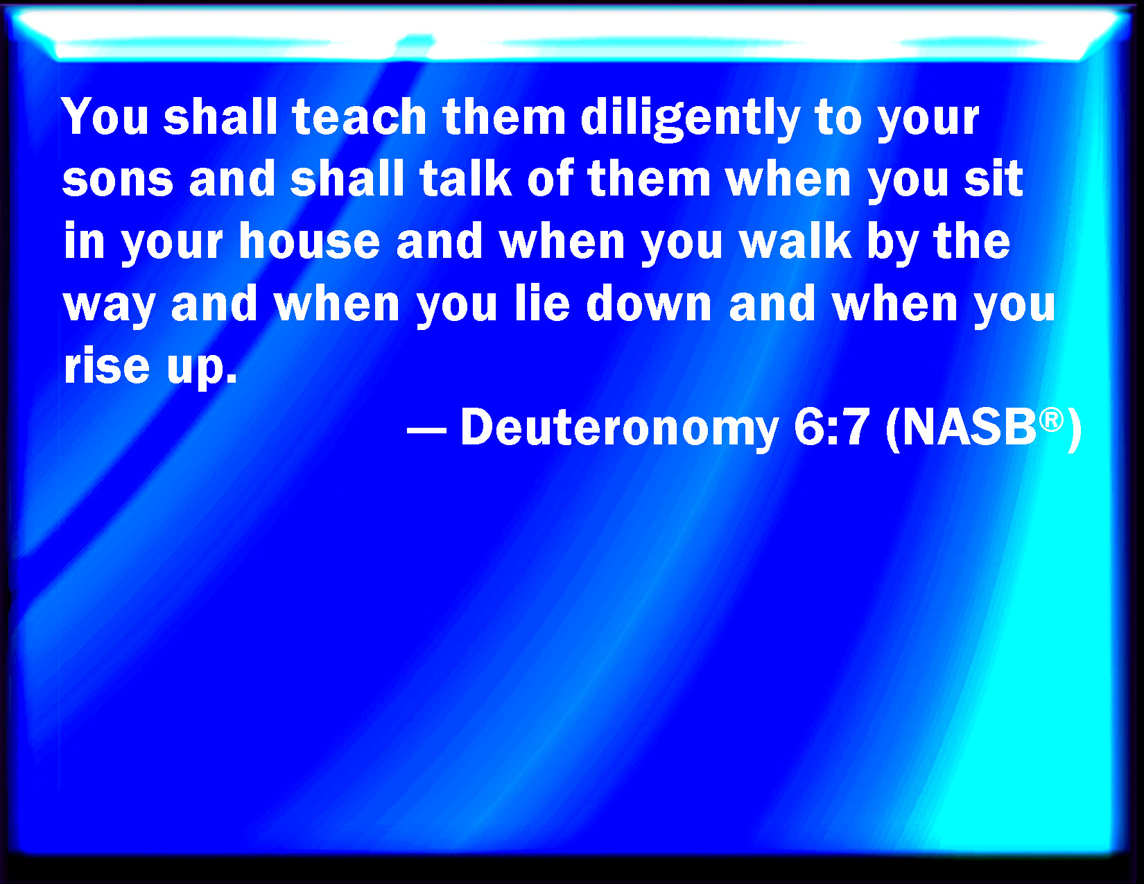 Bible Verse Slide Deuteronomy 6:7 And you shall teach them diligently to your children, and shall talk of them when you sit in your house, and when you walk by the way, and when you lie down, and when you rise up. KJV: And thou shalt teach them diligently unto thy children, and shalt talk of them when thou sittest in thine house, and when thou walkest by the way, and when thou liest down, and when thou risest up. DRB: And thou shalt tell them to thy children, and thou shalt meditate upon them sitting in thy house, and walking on thy journey, sleeping and rising. DBT: and thou shalt impress them on thy sons, and shalt talk of them when thou sittest in thy house, and when thou goest on the way, and when thou liest down, and when thou risest up. ERV: and thou shalt teach them diligently unto thy children, and shalt talk of them when thou sittest in thine house, and when thou walkest by the way, and when thou liest down, and when thou risest up. WBT: And thou shalt teach them diligently to thy children, and shalt talk of them when thou sittest in thy house, and when thou walkest by the way, and when thou liest down, and when thou risest up. WEB: and you shall teach them diligently to your children, and shall talk of them when you sit in your house, and when you walk by the way, and when you lie down, and when you rise up. YLT: and thou hast repeated them to thy sons, and spoken of them in thy sitting in thine house, and in thy walking in the way, and in thy lying down, and in thy rising up,Links Deuteronomy 6:7 NIV • Deuteronomy 6:7 NLT • Deuteronomy 6:7 ESV • Deuteronomy 6:7 NASB • Deuteronomy 6:7 KJV • Deuteronomy 6:7 Interlinear • Deuteronomy 6:7 Commentaries • Deuteronomy 6:7 Parallel Texts • Deuteronomy 6:7 Bible Apps • Deuteronomy 6:7 Parallel • Bible Hub |