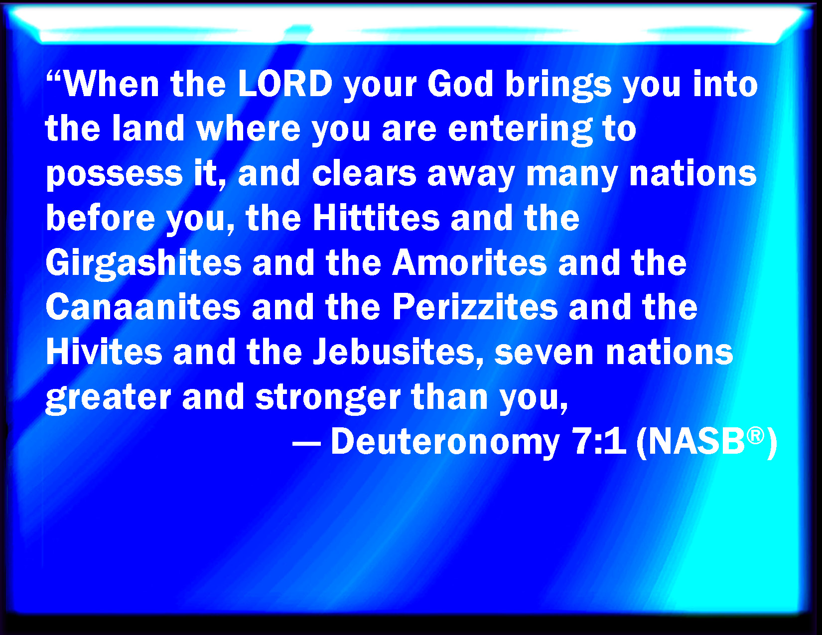 Bible Verse Slide Deuteronomy 7:1 When the LORD your God shall bring you into the land where you go to possess it, and has cast out many nations before you, the Hittites, and the Girgashites, and the Amorites, and the Canaanites, and the Perizzites, and the Hivites, and the Jebusites, seven nations greater and mightier than you; KJV: When the LORD thy God shall bring thee into the land whither thou goest to possess it, and hath cast out many nations before thee, the Hittites, and the Girgashites, and the Amorites, and the Canaanites, and the Perizzites, and the Hivites, and the Jebusites, seven nations greater and mightier than thou; DRB: When the Lord thy God shall have brought thee into the land, which thou art going in to possess, and shall have destroyed many nations before thee, the Hethite, and the Gergezite, and the Amorrhite, and the Chanaanite, and the Pherezite, and the Hevite, and the Jebusite, seven nations much more numerous than thou art, and stronger than thou: DBT: When Jehovah thy God shall bring thee into the land whither thou goest to possess it, and shall cast out many nations from before thee, the Hittites, and the Girgashites, and the Amorites, and the Canaanites, and the Perizzites, and the Hivites, and the Jebusites, seven nations greater and mightier than thou, ERV: When the LORD thy God shall bring thee into the land whither thou goest to possess it, and shall cast out many nations before thee, the Hittite, and the Girgashite, and the Amorite, and the Canaanite, and the Perizzite, and the Hivite, and the Jebusite, seven nations greater and mightier than thou; WBT: When the LORD thy God shall bring thee into the land whither thou goest to possess it, and hath cast out many nations before thee, the Hittites, and the Girgashites, and the Amorites, and the Canaanites, and the Perrizites, and the Hivites, and the Jebusites, seven nations greater and mightier than thou; WEB: When Yahweh your God shall bring you into the land where you go to possess it, and shall cast out many nations before you, the Hittite, and the Girgashite, and the Amorite, and the Canaanite, and the Perizzite, and the Hivite, and the Jebusite, seven nations greater and mightier than you; YLT: 'When Jehovah thy God doth bring thee in unto the land whither thou art going in to possess it, and He hath cast out many nations from thy presence, the Hittite, and the Girgashite, and the Amorite, and the Canaanite, and the Perizzite, and the Hivite, and the Jebusite, seven nations more numerous and mighty than thou,Links Deuteronomy 7:1 NIV • Deuteronomy 7:1 NLT • Deuteronomy 7:1 ESV • Deuteronomy 7:1 NASB • Deuteronomy 7:1 KJV • Deuteronomy 7:1 Interlinear • Deuteronomy 7:1 Commentaries • Deuteronomy 7:1 Parallel Texts • Deuteronomy 7:1 Bible Apps • Deuteronomy 7:1 Parallel • Bible Hub |