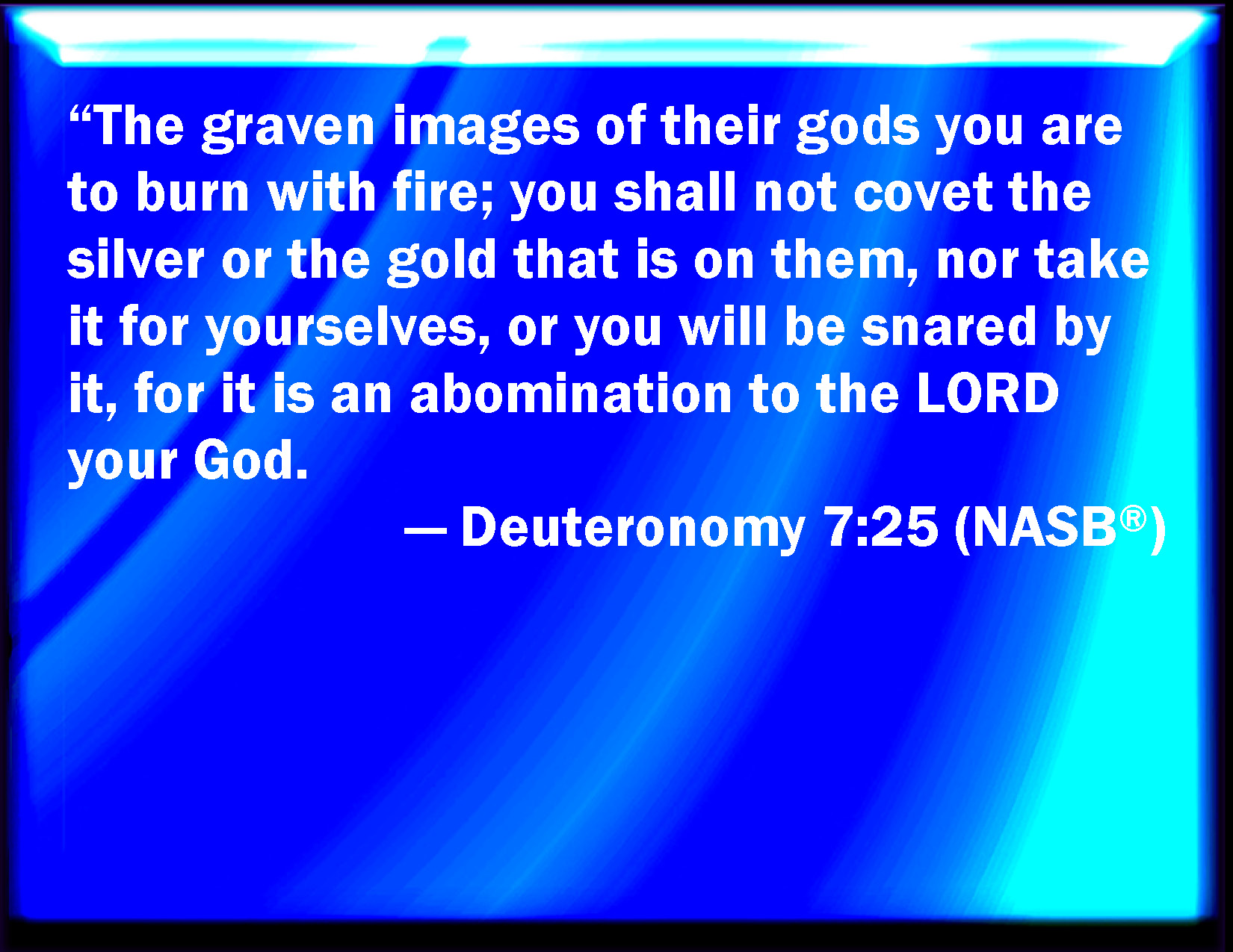 Bible Verse Slide Deuteronomy 7:25 The graven images of their gods shall you burn with fire: you shall not desire the silver or gold that is on them, nor take it to you, lest you be snared therein: for it is an abomination to the LORD your God. KJV: The graven images of their gods shall ye burn with fire: thou shalt not desire the silver or gold that is on them, nor take it unto thee, lest thou be snared therein: for it is an abomination to the LORD thy God. DRB: Their graven things thou shalt burn with fire: thou shalt not covet the silver and gold of which they are made, neither shalt thou take to thee any thing thereof, lest thou offend, because it is an abomination to the Lord thy God. DBT: The graven images of their gods shall ye burn with fire; thou shalt not covet the silver and gold that is on them and take it unto thee, lest thou be ensnared therein; for it is an abomination to Jehovah thy God. ERV: The graven images of their gods shall ye burn with fire: thou shalt not covet the silver or the gold that is on them, nor take it unto thee, lest thou be snared therein: for it is an abomination to the LORD thy God: WBT: The graven images of their gods shall ye burn with fire: thou shalt not desire the silver or gold that is on them, nor take it to thee, lest thou shouldst be snared in it: for it is an abomination to the LORD thy God. WEB: You shall burn the engraved images of their gods with fire. You shall not covet the silver or the gold that is on them, nor take it for yourself, lest you be snared in it; for it is an abomination to Yahweh your God. YLT: The graven images of their gods ye do burn with fire; thou dost not desire the silver and gold on them, nor hast thou taken it to thyself, lest thou be snared by it, for the abomination of Jehovah thy God it is;Links Deuteronomy 7:25 NIV • Deuteronomy 7:25 NLT • Deuteronomy 7:25 ESV • Deuteronomy 7:25 NASB • Deuteronomy 7:25 KJV • Deuteronomy 7:25 Interlinear • Deuteronomy 7:25 Commentaries • Deuteronomy 7:25 Parallel Texts • Deuteronomy 7:25 Bible Apps • Deuteronomy 7:25 Parallel • Bible Hub |