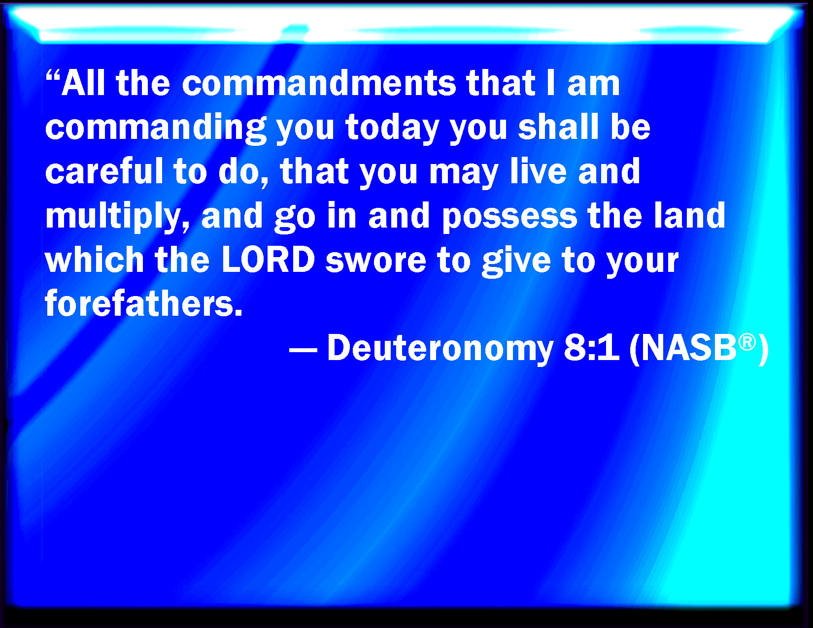 Bible Verse Slide Deuteronomy 8:1 All the commandments which I command you this day shall you observe to do, that you may live, and multiply, and go in and possess the land which the LORD swore to your fathers. KJV: All the commandments which I command thee this day shall ye observe to do, that ye may live, and multiply, and go in and possess the land which the LORD sware unto your fathers. DRB: All the commandments, that I command thee this day, take great care to observe: that you may live, and be multiplied, and going in may possess the land, for which the Lord swore to your fathers. DBT: Every commandment which I command thee this day shall ye take heed to do, that ye may live, and multiply, and enter in and possess the land which Jehovah swore unto your fathers. ERV: All the commandment which I command thee this day shall ye observe to do, that ye may live, and multiply, and go in and possess the land which the LORD sware unto your fathers. WBT: All the commandments which I command thee this day shall ye observe to do, that ye may live, and multiply, and go in and possess the land which the LORD swore to your fathers. WEB: You shall observe to do all the commandment which I command you this day, that you may live, and multiply, and go in and possess the land which Yahweh swore to your fathers. YLT: 'All the command which I am commanding thee to-day ye observe to do, so that ye live, and have multiplied, and gone in, and possessed the land which Jehovah hath sworn to your fathers;Links Deuteronomy 8:1 NIV • Deuteronomy 8:1 NLT • Deuteronomy 8:1 ESV • Deuteronomy 8:1 NASB • Deuteronomy 8:1 KJV • Deuteronomy 8:1 Interlinear • Deuteronomy 8:1 Commentaries • Deuteronomy 8:1 Parallel Texts • Deuteronomy 8:1 Bible Apps • Deuteronomy 8:1 Parallel • Bible Hub |